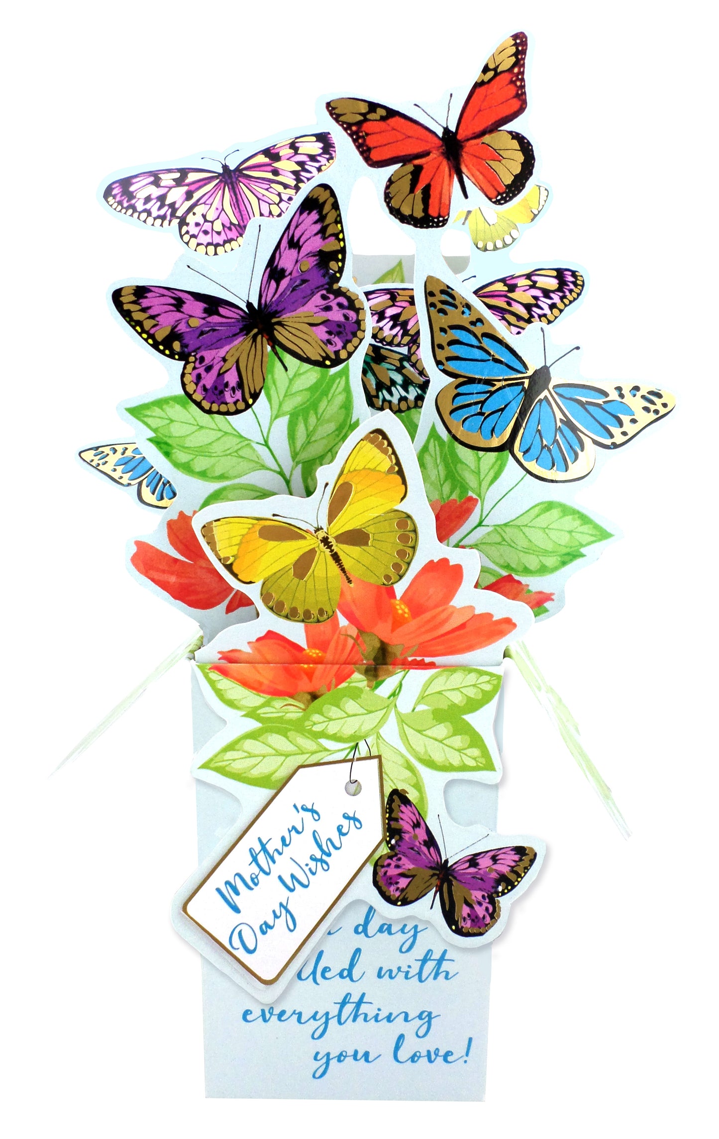 Looking for greeting card ideas for her? This vibrant pop up greeting card, featuring colourful butterflies, captures your excitement and love for the most important woman in your life. The heartfelt gesture of a Mother's Day card is made even more special with the surprise of a vibrant pop up, bringing joy and happiness to your special someone.
