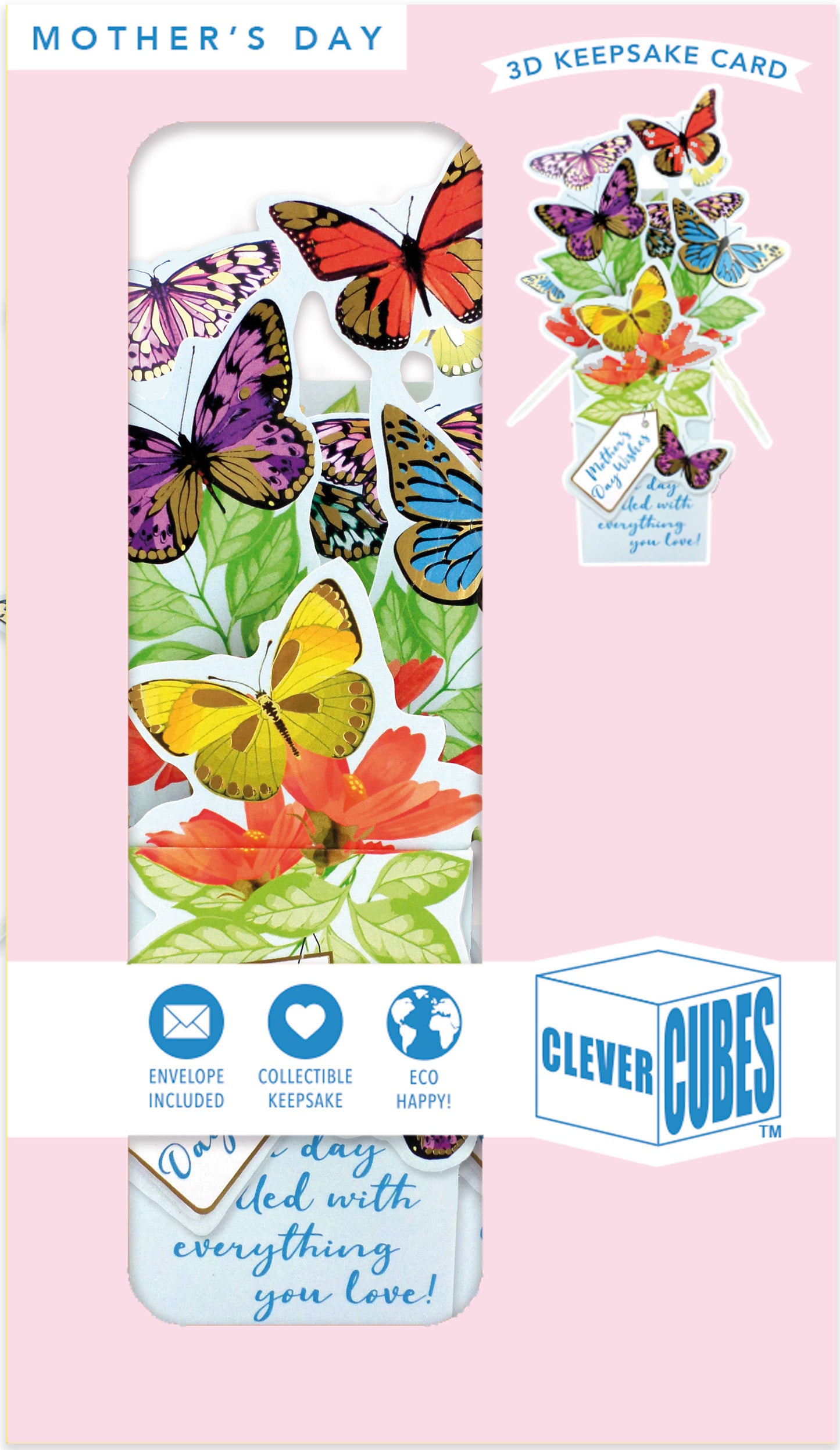 Details: Celebrate Mother's Day with Second Nature's Clever Cubes pop-up card. The card features colorful butterflies and a heartfelt message of love. Foiled for an extra special touch, it's perfect for brightening up any desk or mantelpiece.