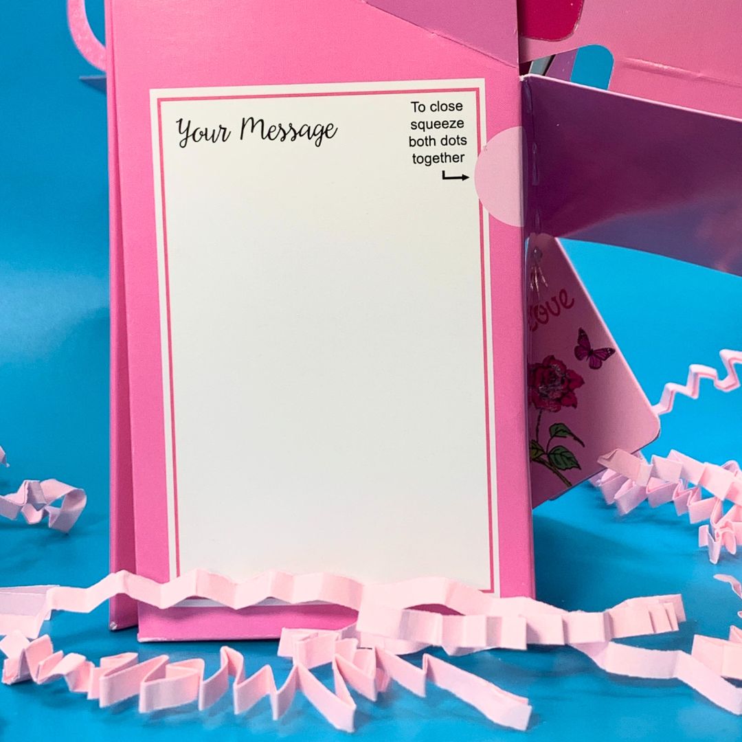 Instructions: Just close the pop up flat and write your message in the space on the side of the card or on the tag provided before placing in the envelope for sending
