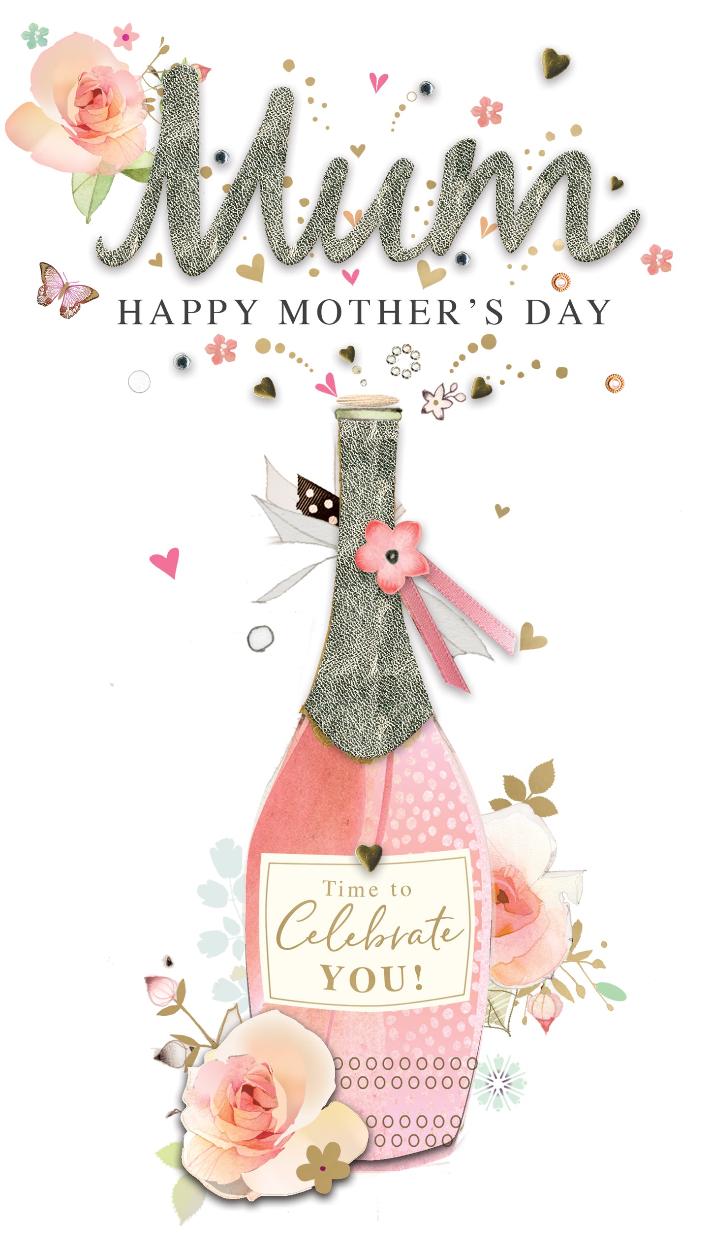Details: Celebrate Mum's special day with this beautiful handmade card from Second Nature's Champagne range. With a delightful pink champagne bottle surrounded by flowers and love hearts, and the caption 'Mum Happy Mother's Day', this card will make her feel loved and appreciated.