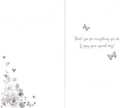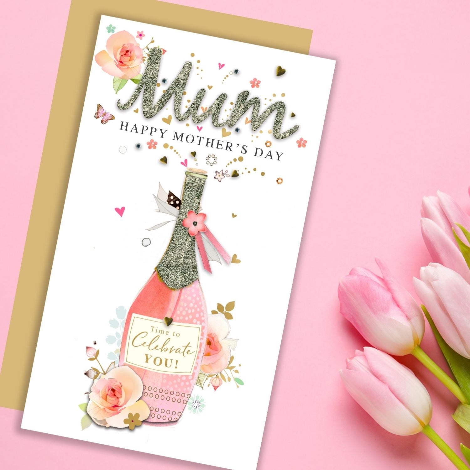 Looking for greeting card ideas for her? This elegant handmade greeting card features a pink champagne bottle with flowers and love hearts, perfect for surprising a special Mum. It captures excitement and shows appreciation for all the love, care and sacrifices she has made. Give her the love she deserves this Mother's Day.