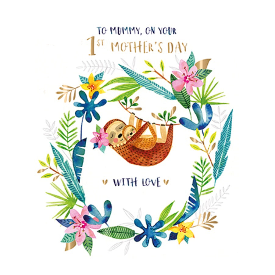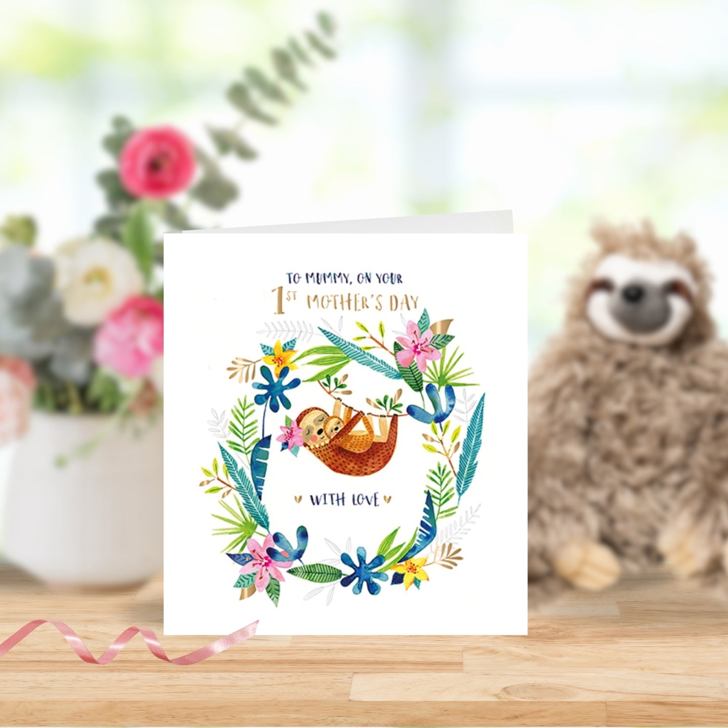 Details: A beautiful foil finished and decorated Mother's Day greeting card featuring a sloth and her baby from the handmade card company Talking Pictures