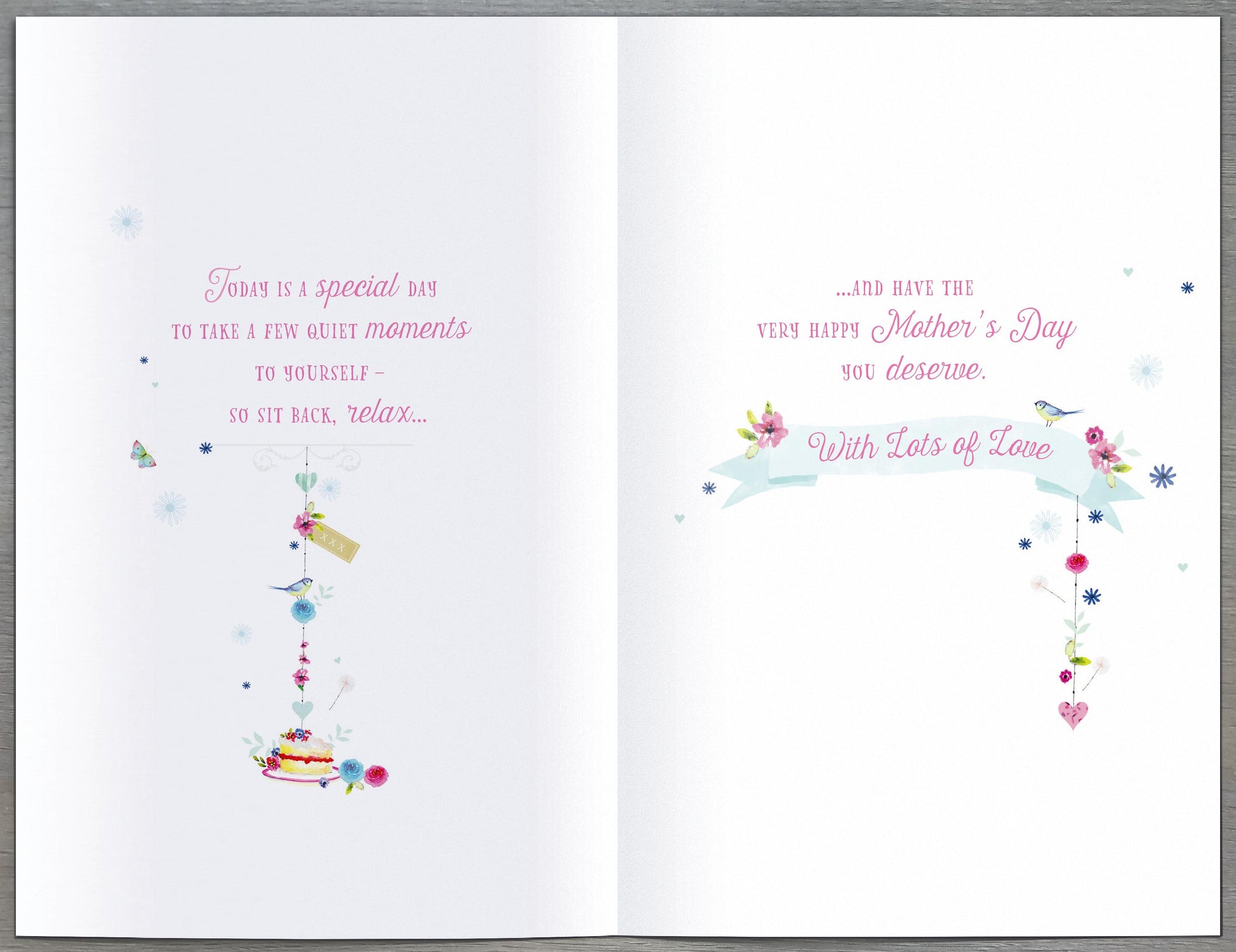 Message: Today is a special DAY to take a few quiet moments to yourself - so sit back, relax… …and have the very happy mother's day you deserve. With lots of love