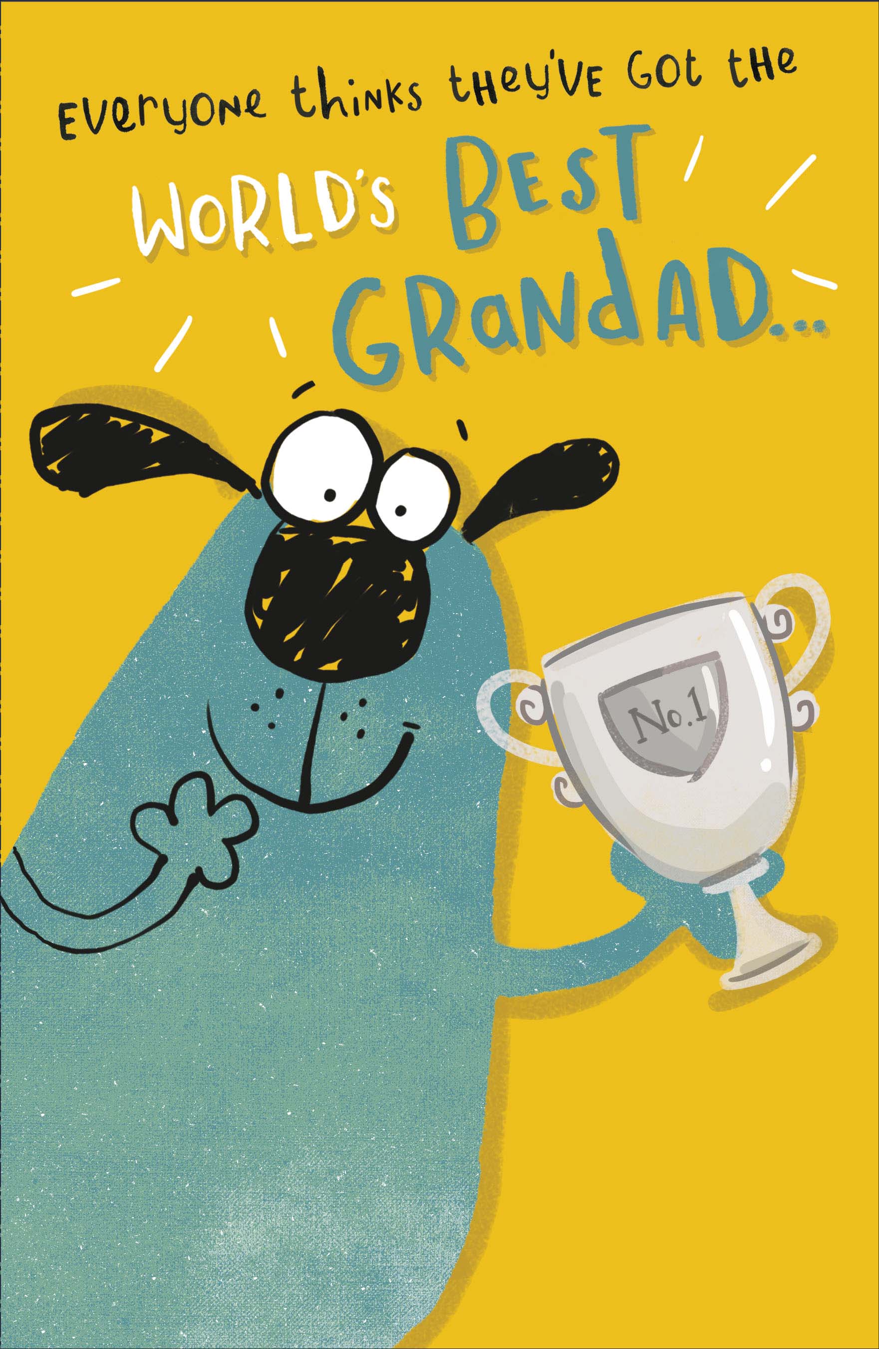 Details: A funny Father's Day greeting card for Grandad with a colourful glossy finish featuring a cartoon dog holding a trophy