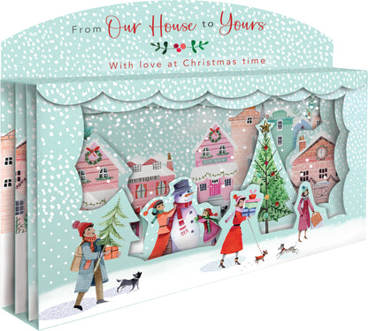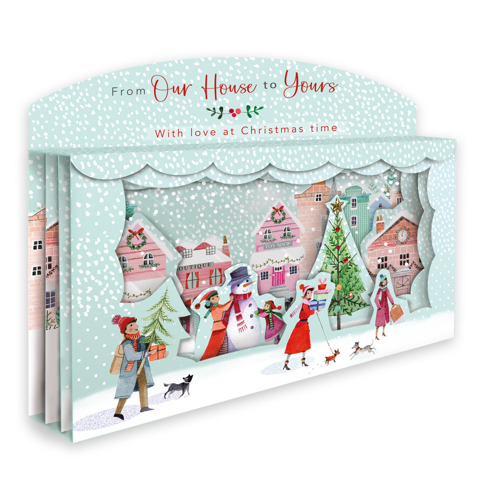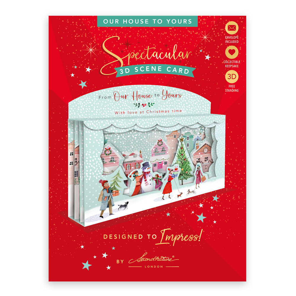 Details: A fun Christmas greeting card from Second Nature's magical Spectacular range of freestanding multi-layered cards that unfold to reveal a fabulous festive scene within a 3D window, hand-finished with embellishments