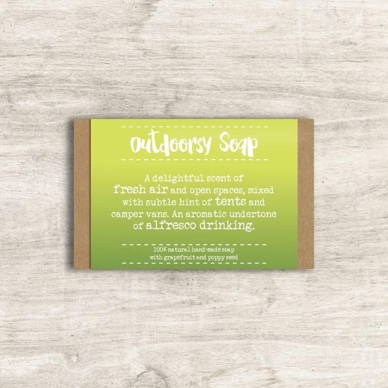 Caption: "Outdoorsy Soap A delightful scent of fresh air and open spaces, mixed with subtle hint of tents and camper vans. An aromatic undertone of alfresco drinking."