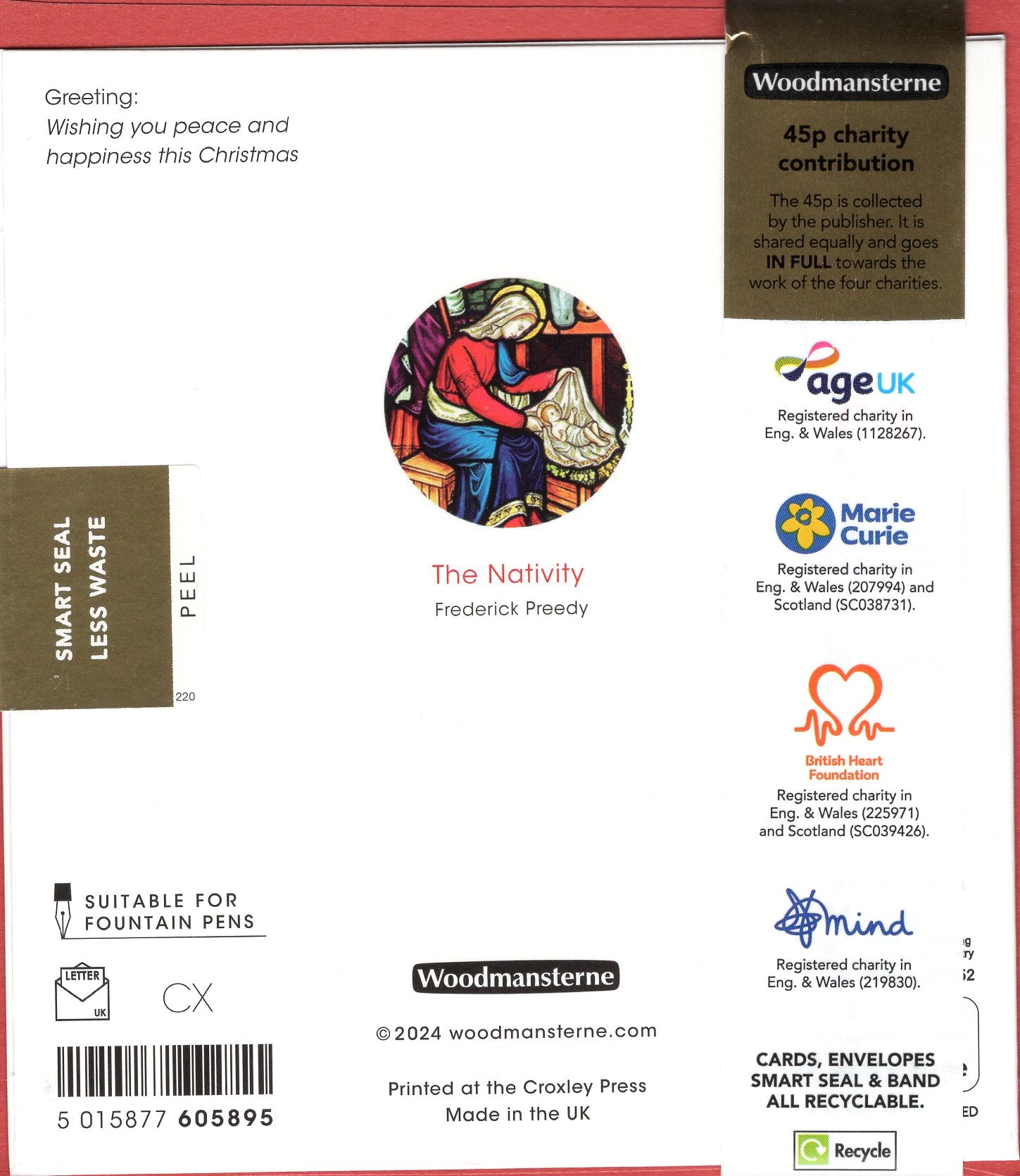 Details: This Woodmansterne charity pack of greeting cards features a beautiful stained glass nativity scene with the caption 'The Nativity'. The thoughtful design is part of the Woodmansterne range and is perfect for spreading joy during the Christmas season while supporting charitable causes.