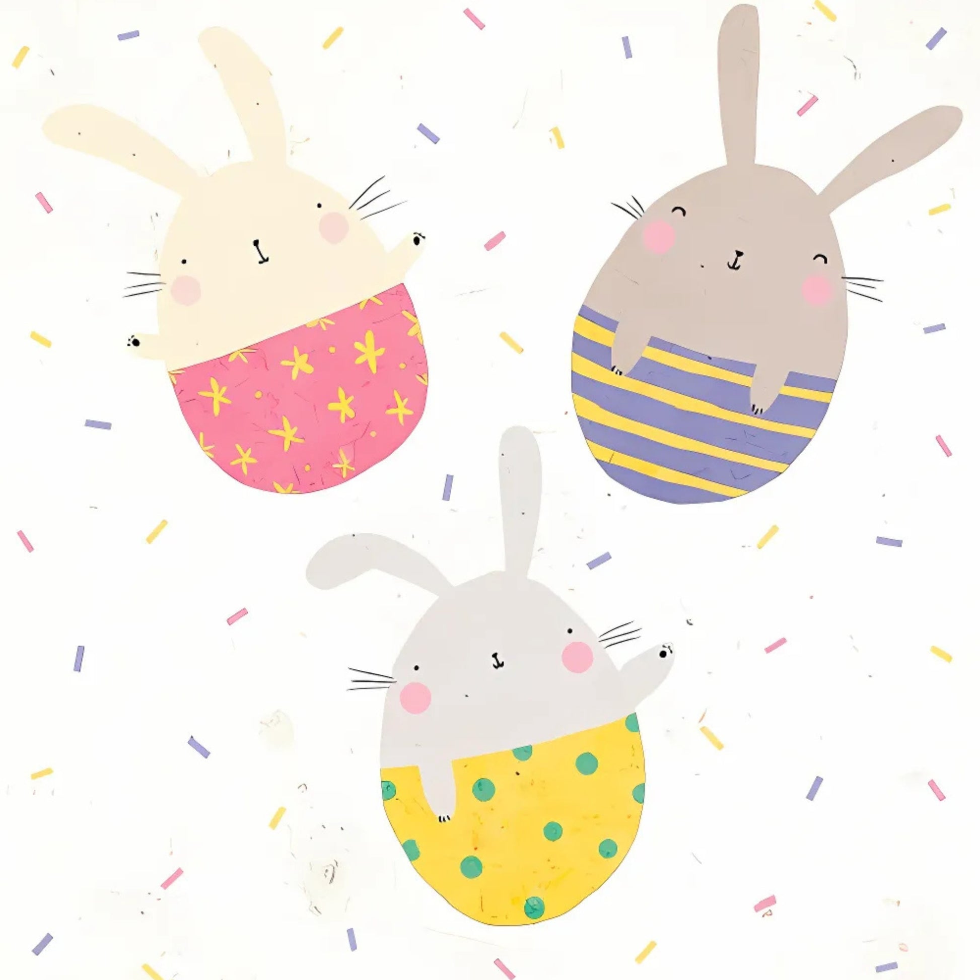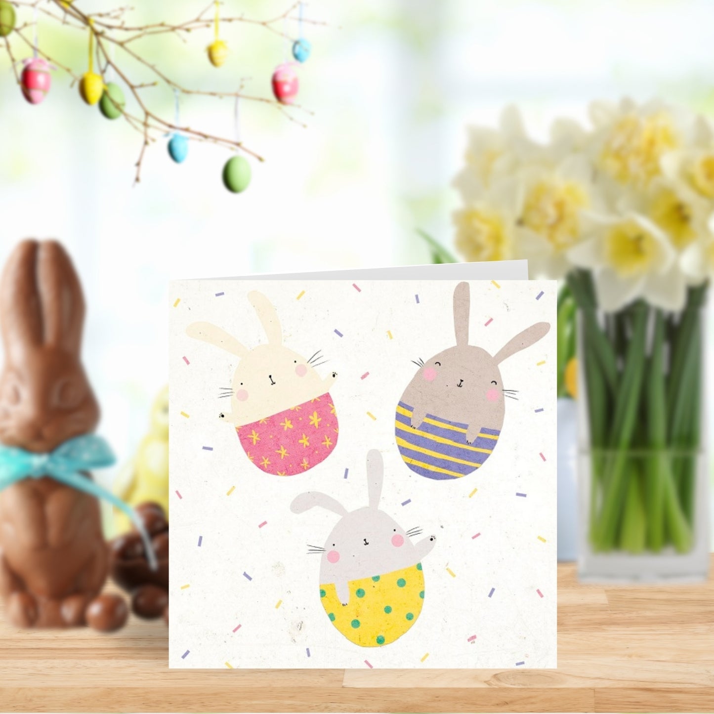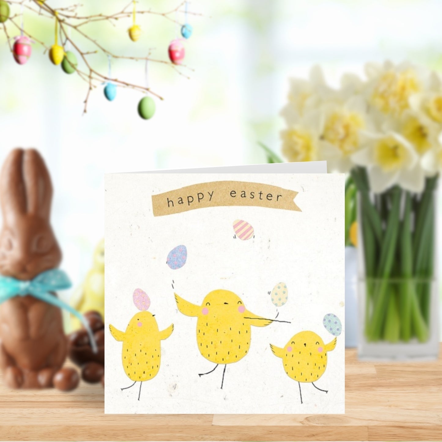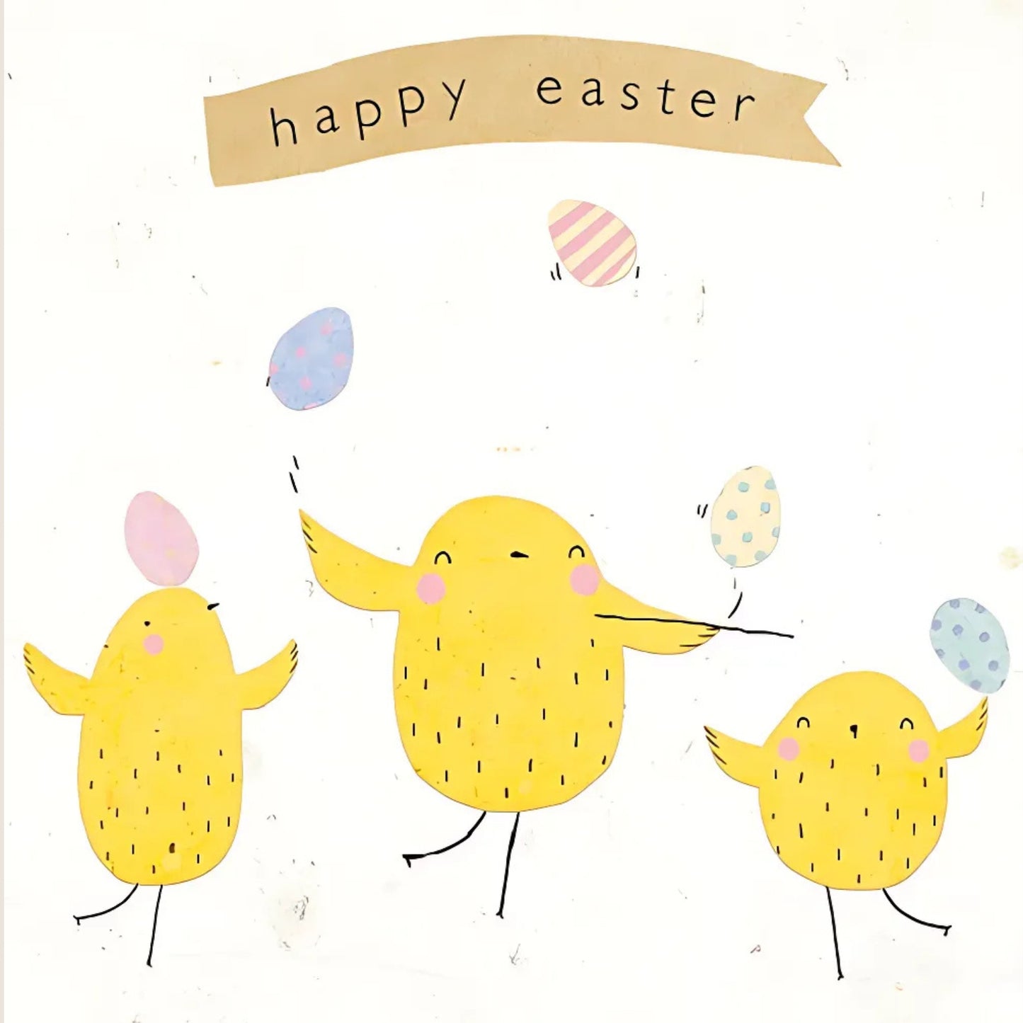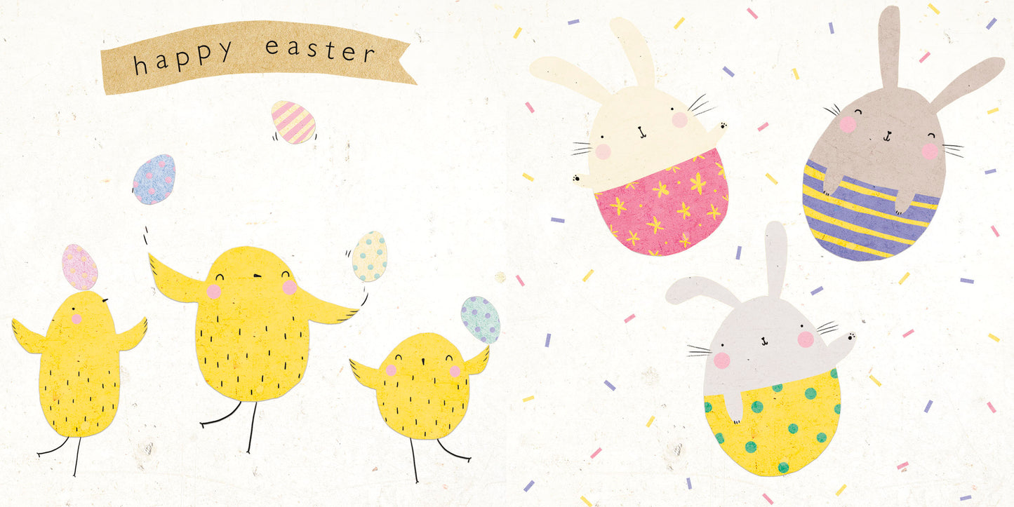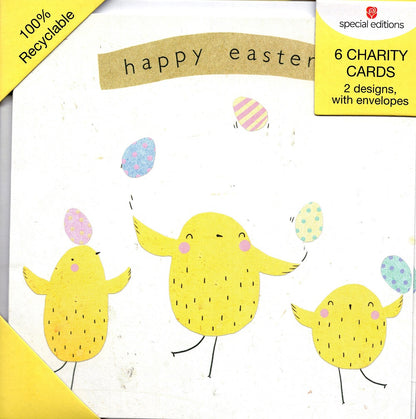 Details: A pack of 6 charity Easter cards in two cute designs of dancing chicks and bunnies in Easter eggs, complete with white envelopes