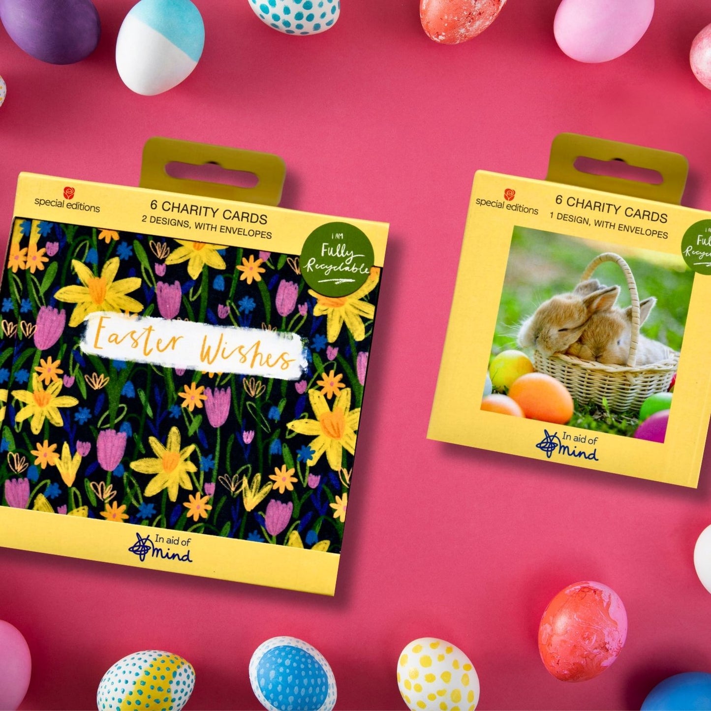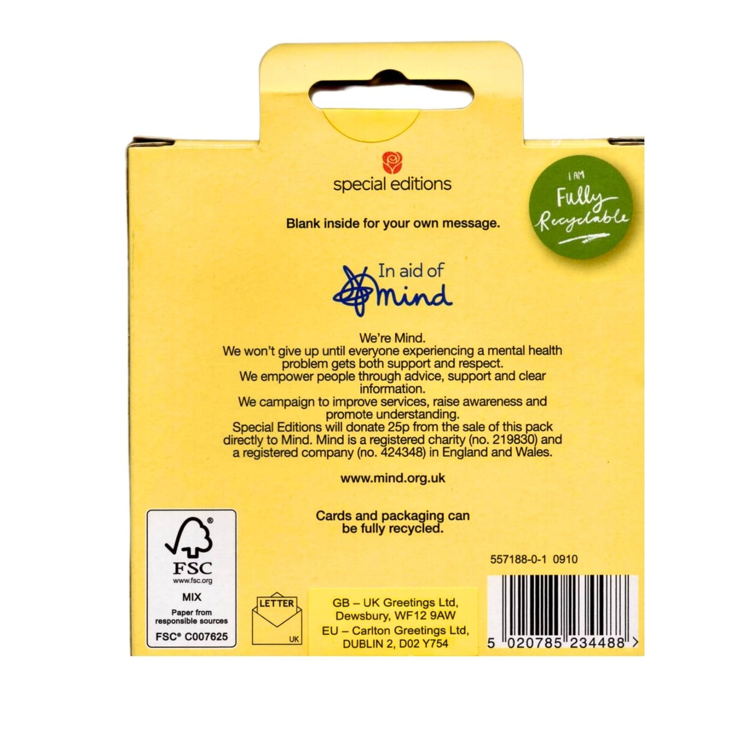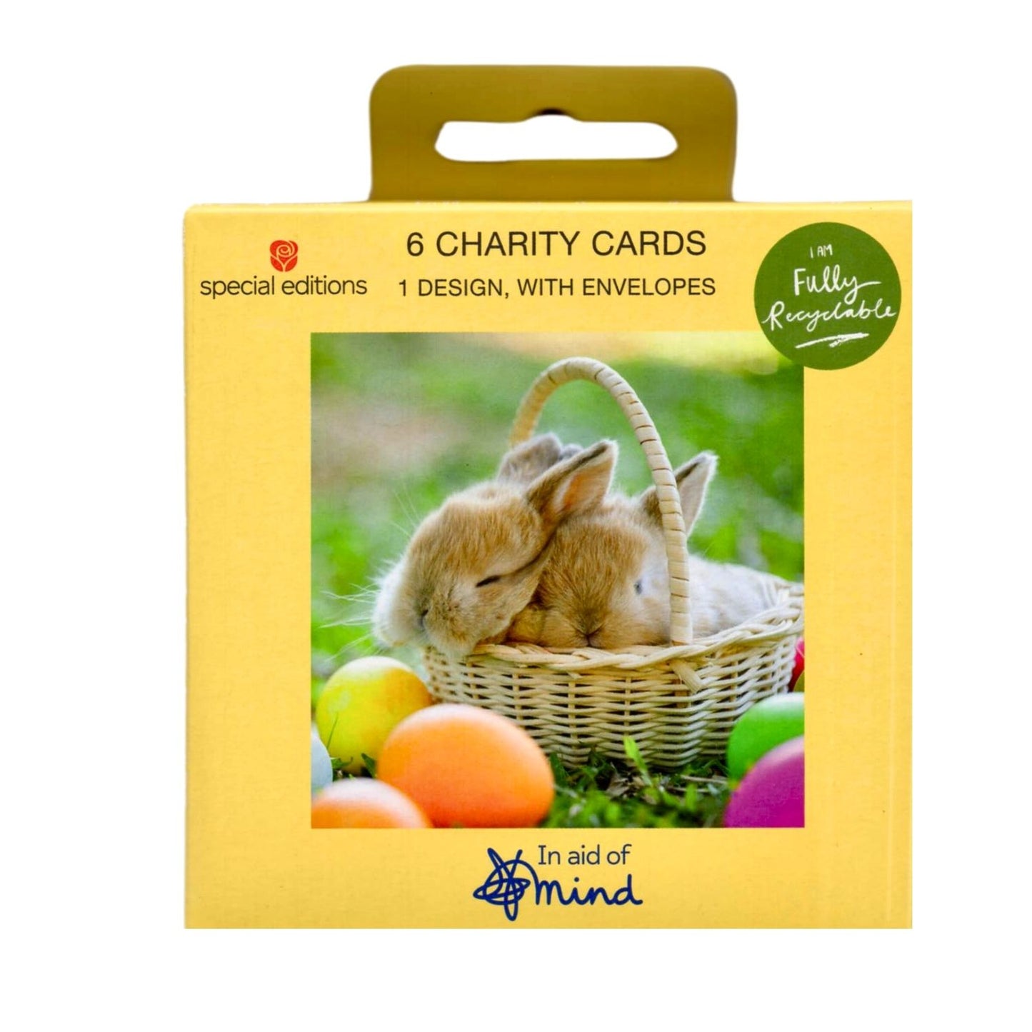 Details: This Special Editions pack of 6 charity greeting cards features a heartwarming design of two sleeping Easter bunnies in a basket. A thoughtful surprise for a special someone, each card supports the charity, Mind.