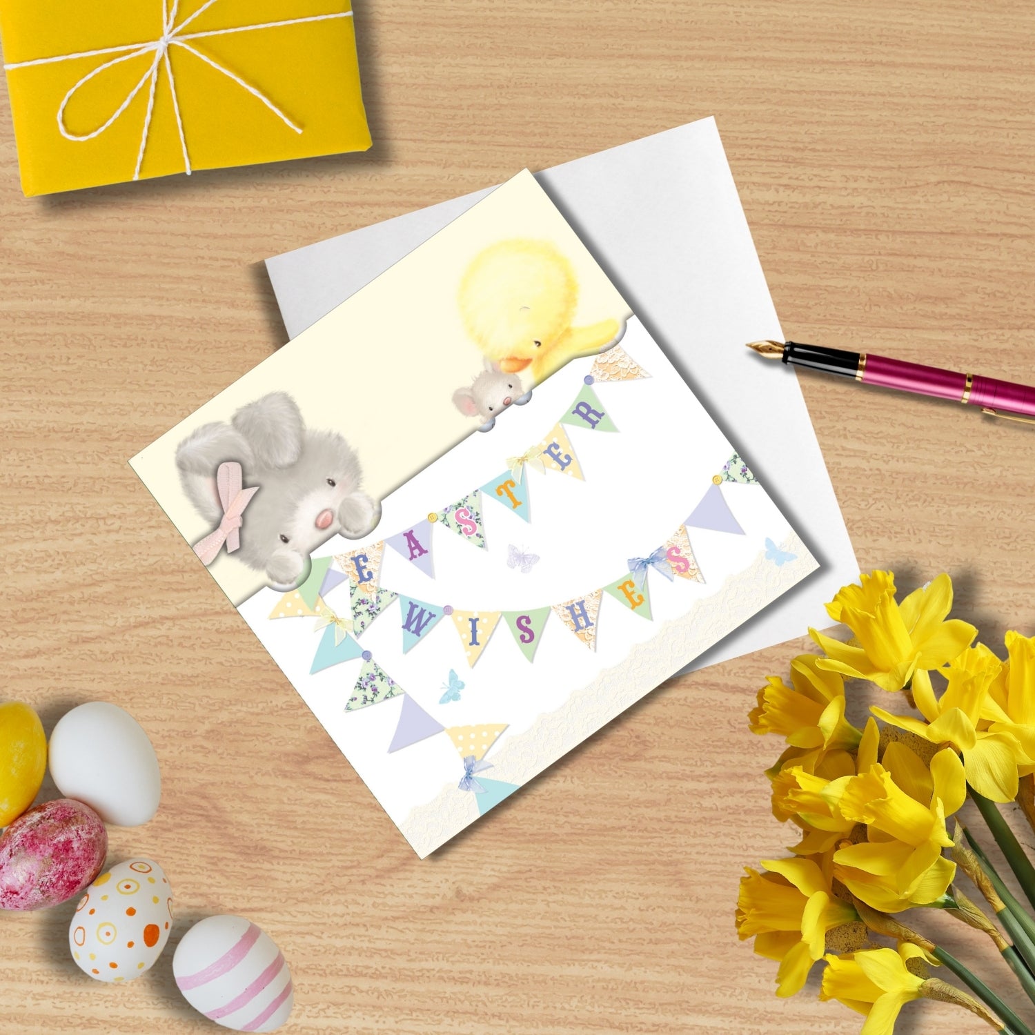 Details: A pack of 6 charity Easter cards, one design featuring an adorable bunny, mouse and duckling, complete with a white envelopes