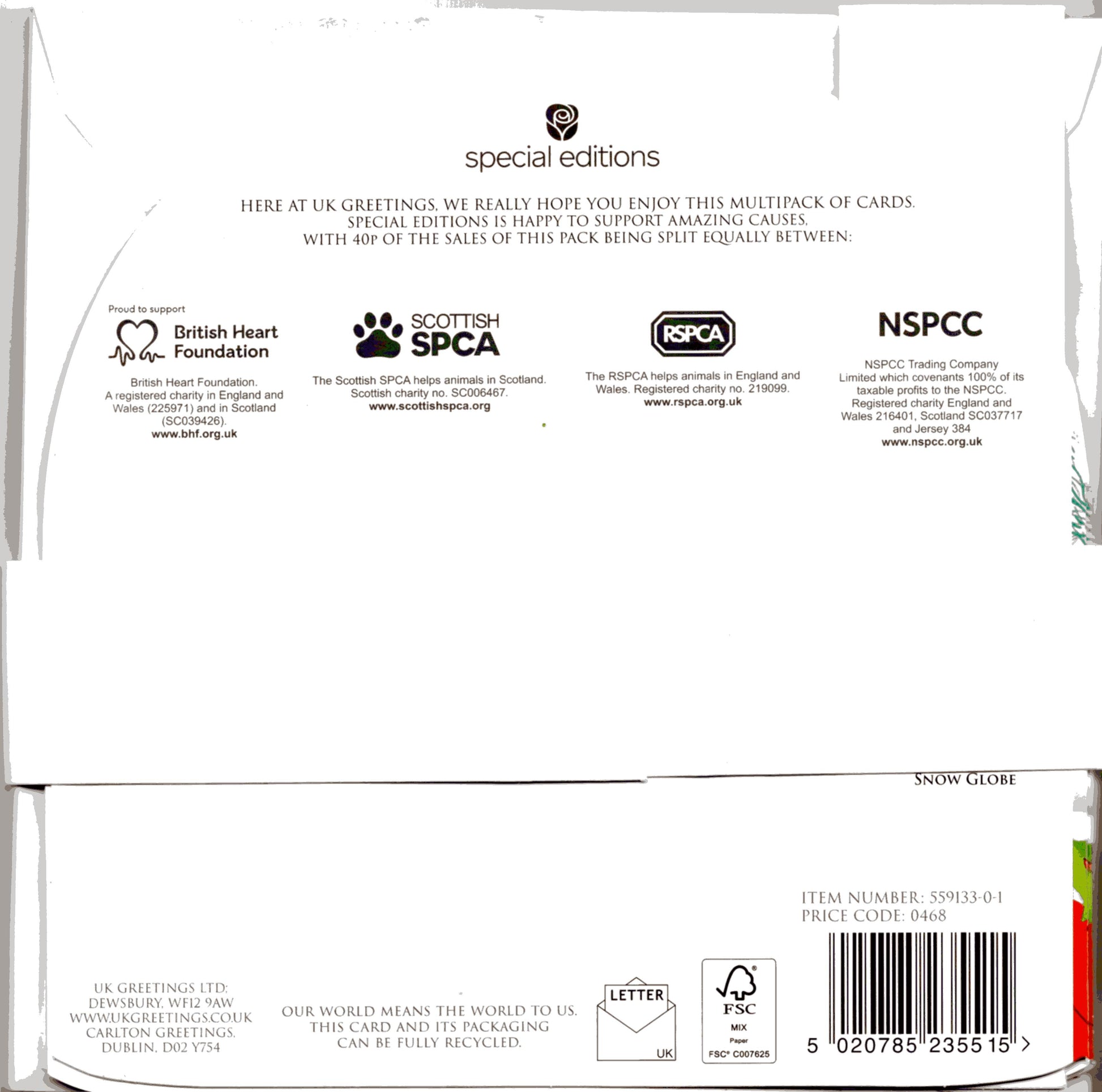 Details: This charitable pack has been thoughtfully designed by Special Editions featuring a festive winter town and Christmas tree inside a snow globe with the caption 'Winter Wishes'. For every pack purchased, 40p will be donated equally between the British Heart Foundation, the RSPCA, the Scottish SPCA and the NSPCC, helping to support their invaluable work.