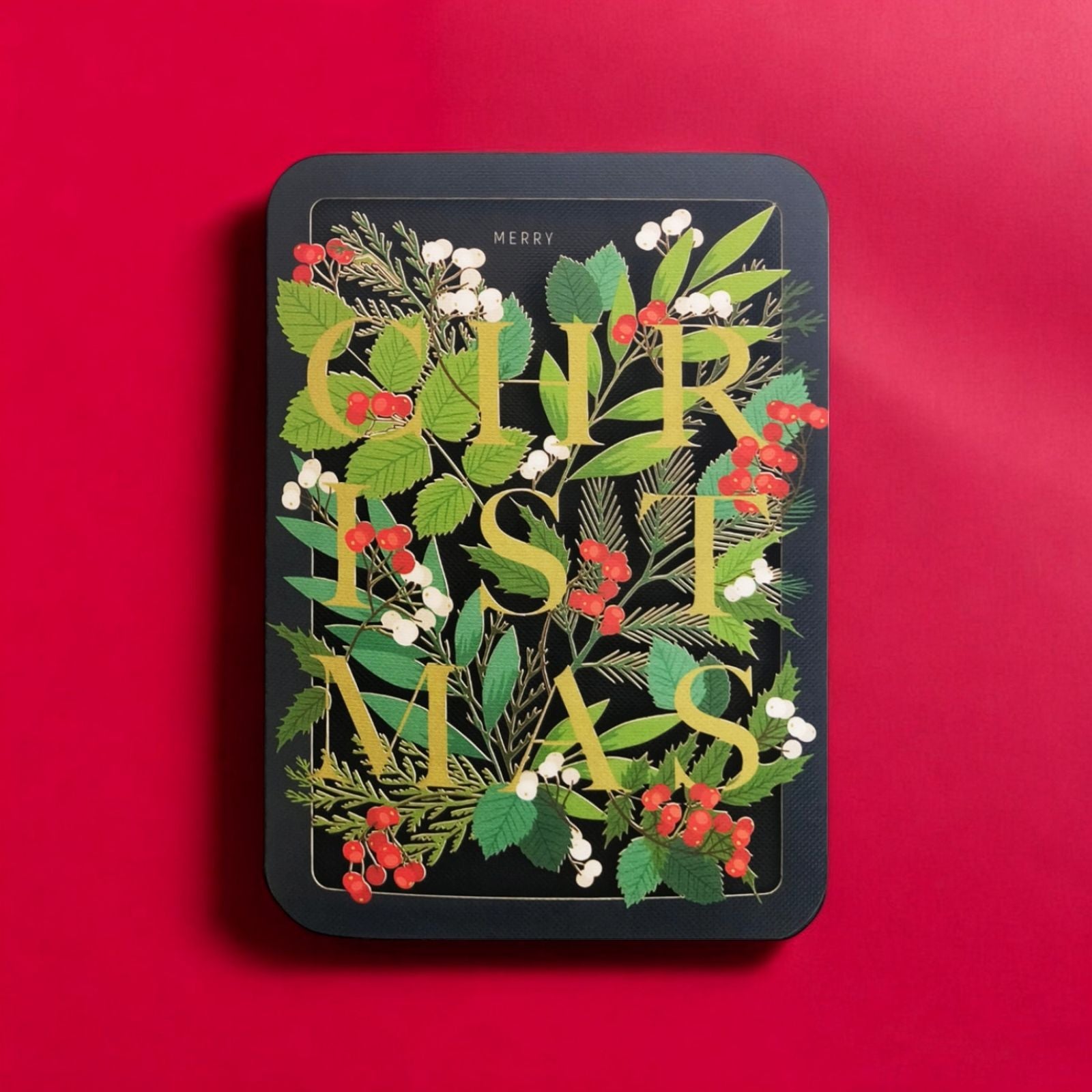Details: This exquisite die-cut card, designed by Alljoy Design, showcases intricate laser-cut artistry with festive holly berries and mistletoe, highlighted by elegant gold foil detailing. The large 'Christmas' inscription adds a touch of cheer. Complete with a cream manila envelope and cello wrapping, this card embodies creativity, perfect for spreading festive joy.