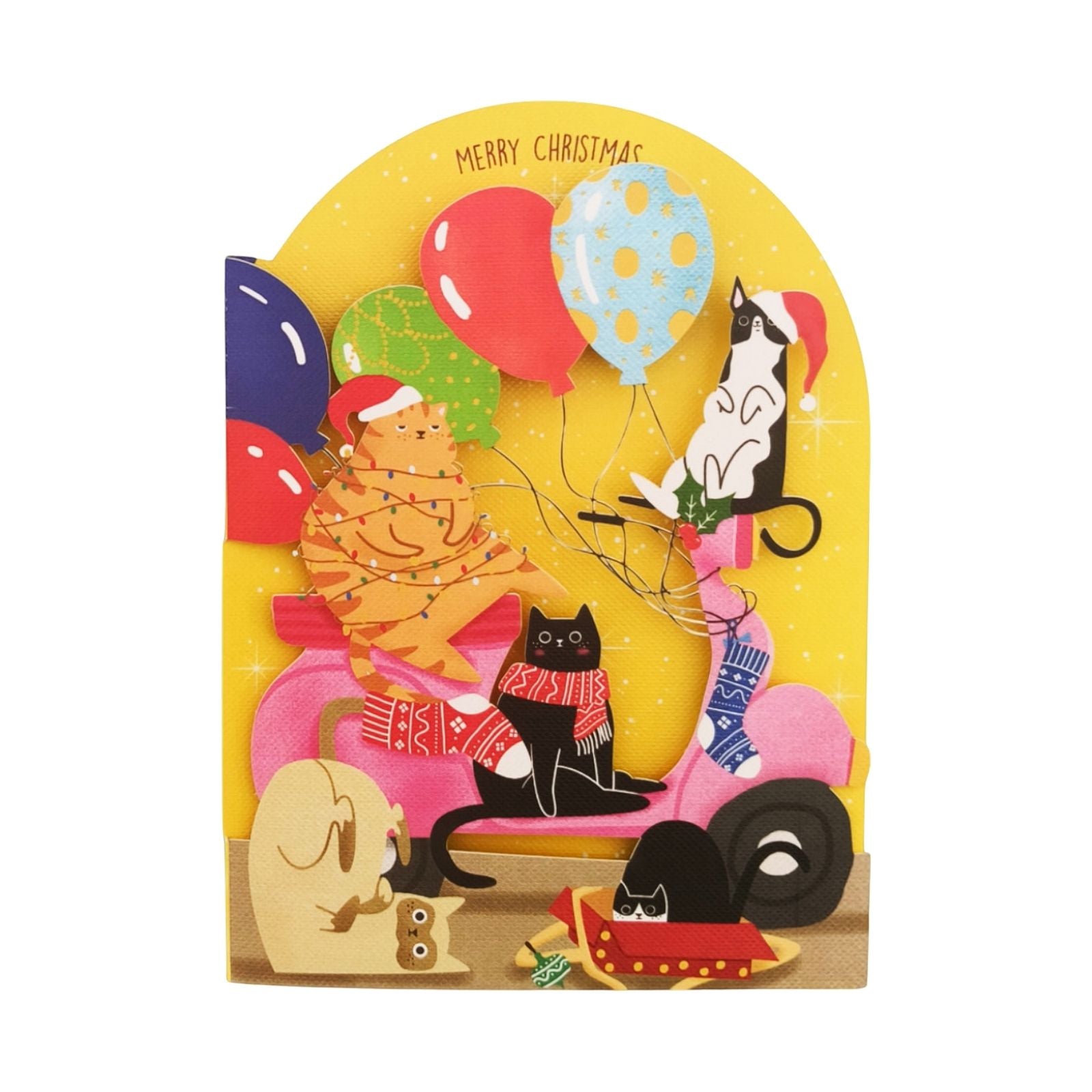 Looking for Christmas greeting card ideas for someone special? This vibrant card captures the joy of the season with its whimsical design of playful cats on a scooter, adorned with festive balloons and lights. The intricate laser-cut details and gold accents create a delightful surprise, making it a perfect way to share warmth and cheer with loved ones.