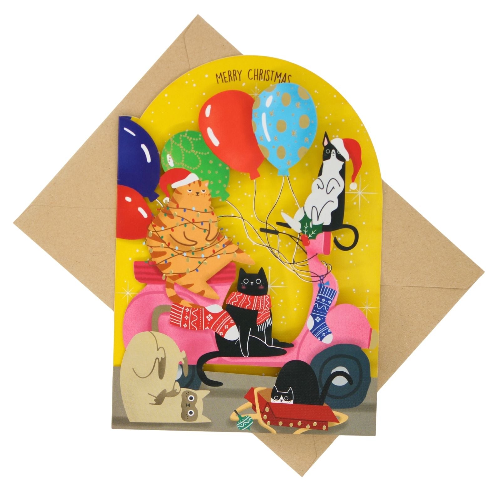 Details: This whimsical greeting card showcases playful cats riding a pink moped, surrounded by balloons and Christmas lights on a vibrant yellow backdrop. Thoughtfully designed with intricate laser-cut details and gold foiling, it comes with a cream manila envelope and features the festive message 'Merry Christmas.' Perfect for spreading Christmas cheer in a fun, colourful way.