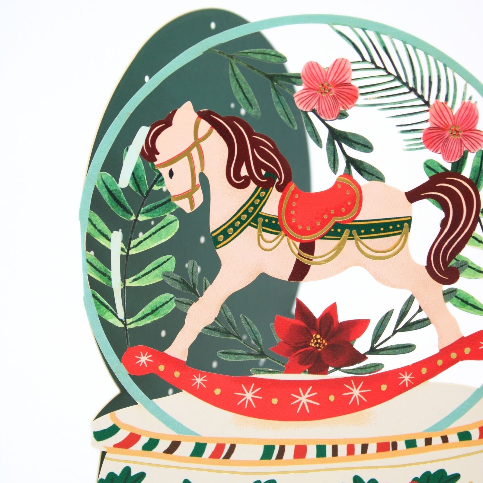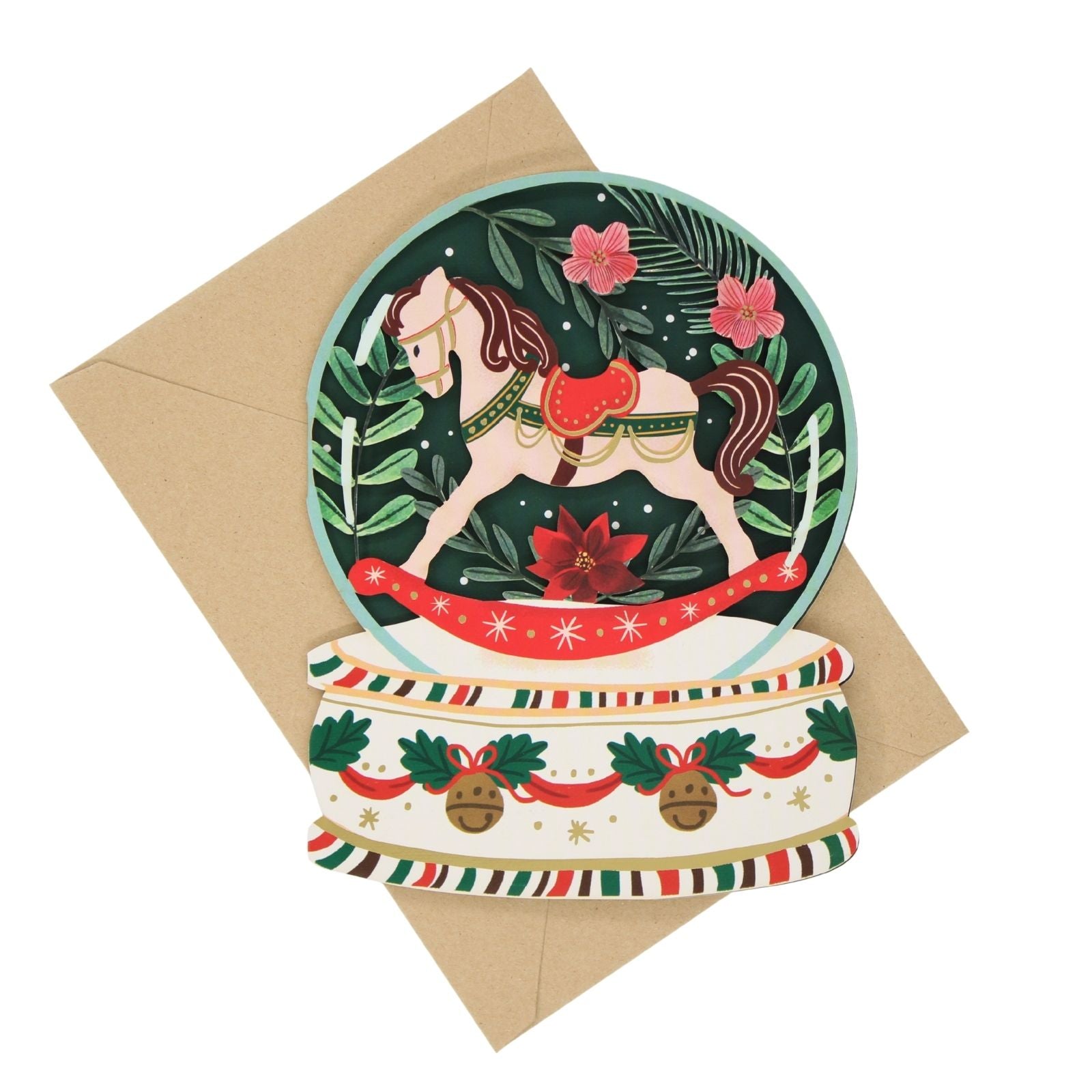 Looking for Christmas greeting card ideas for someone special? This exquisite card captures the magic of the season with its intricate design and gold foil details. The charming rocking horse and poinsettia inside a snow globe evoke nostalgia and warmth, making it a perfect surprise for a loved one, spreading joy and festive cheer.