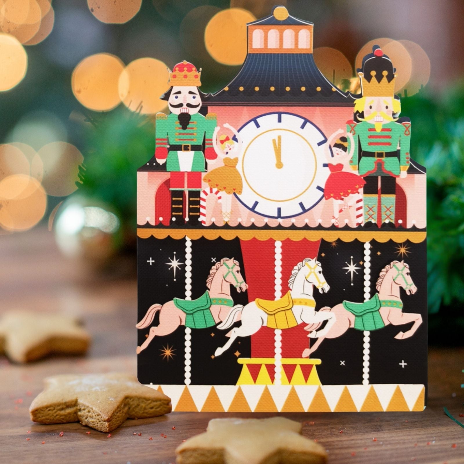 Looking for Christmas greeting card ideas for someone special? This enchanting Christmas card captures the magic of the Nutcracker ballet with its intricate designs and gold foiled details. Its whimsical scene of a carousel, horses, and a clock striking midnight brings joy and nostalgia, making it a heartfelt surprise for someone special during the festive season.