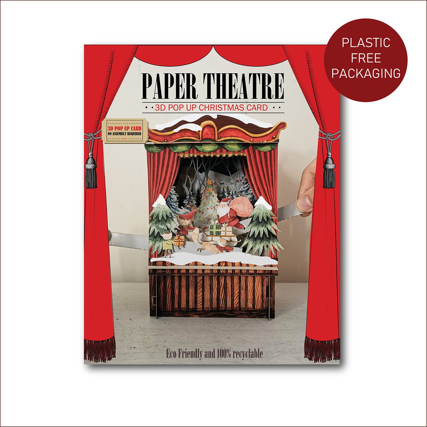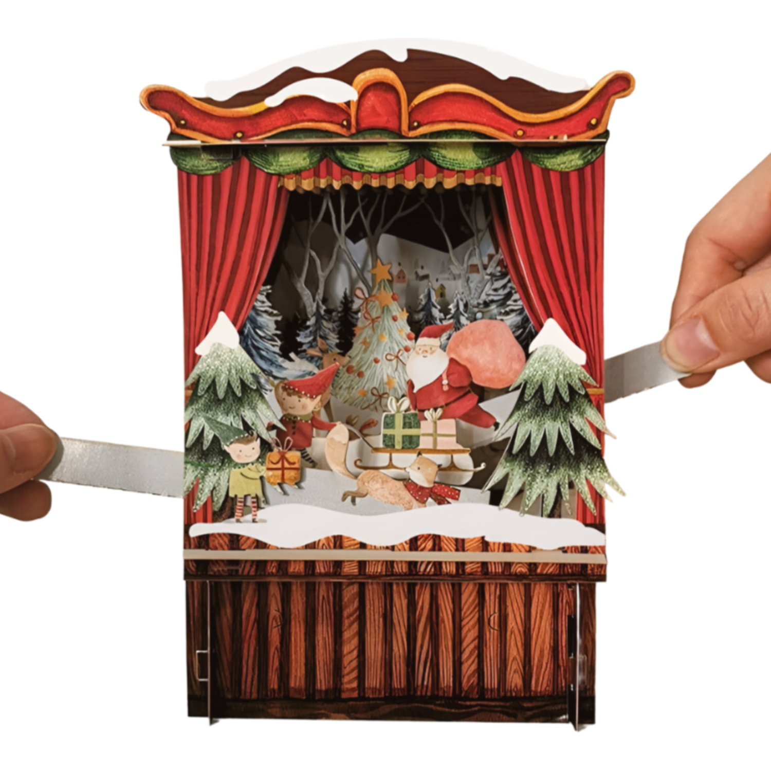 Details: A beautiful laser cut festive pop up greeting card by Alljoy Design constructed with multiple layers of card in a flat design that transform to a miniature theatre stage with movable characters featuring Santa and his elves