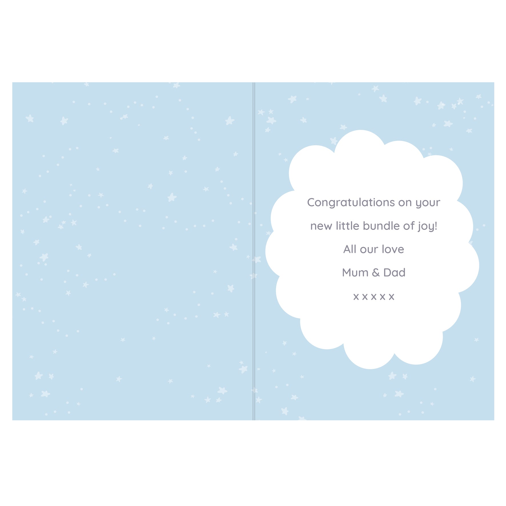 Details: This Personalised '10 little fingers' Baby Boy Card is an adorable way to congratulate the new parents. This card can be personalised with 2 lines of text, with up to 20 characters per line on the front. Inside, this card can be personalised with 5 lines of text, with up to 25 characters per line. Please note the poem '10 little fingers & 10 little toes. A sweet little smile and a cute button nose' is fixed text. The personalisation on the front of this card is fixed uppercase. The personalisation inside will appear as requested. Ideal for New Borns, New Parents and Christenings.