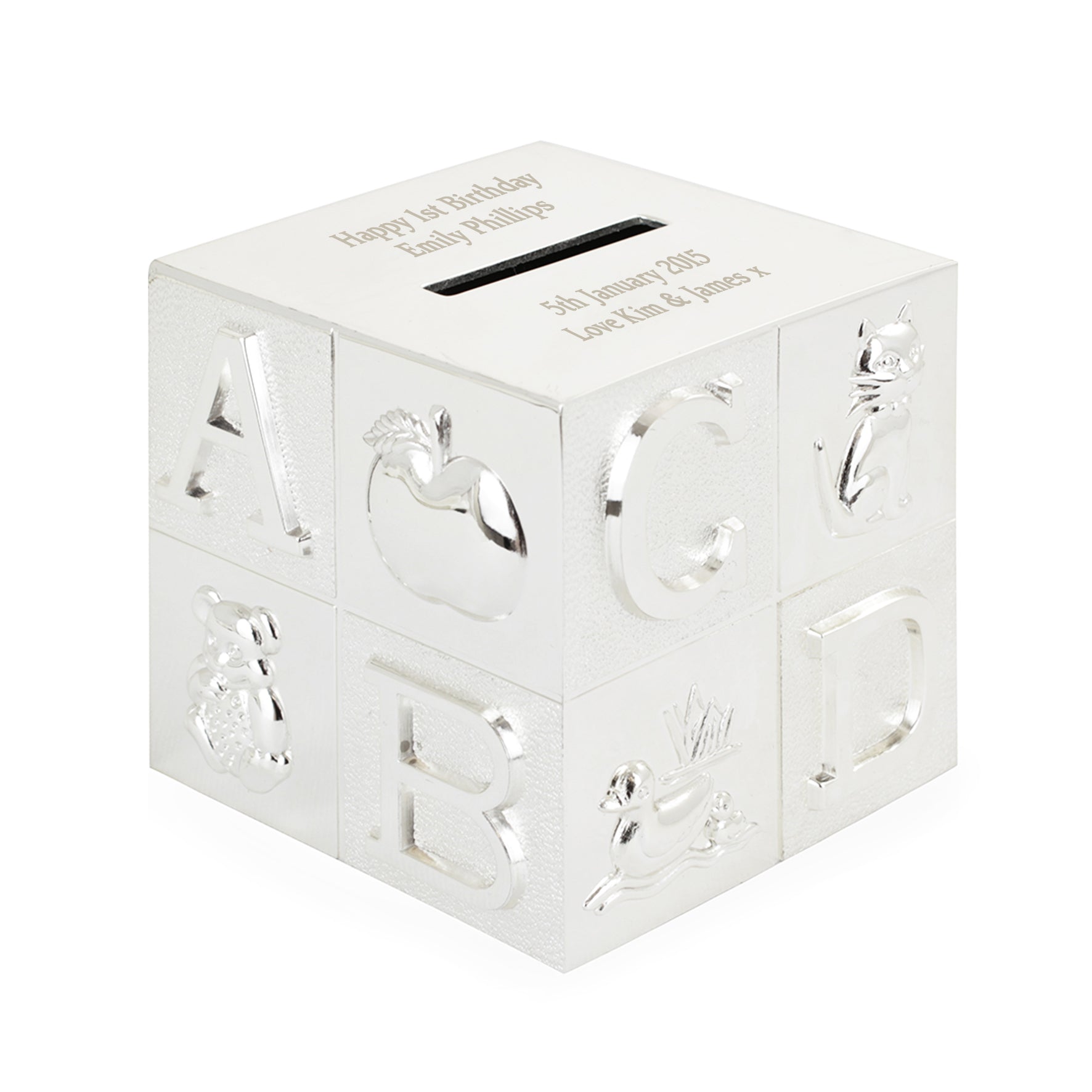 Details: Personalise this silver plated ABC Money Box with any message over 4 lines and up to 20 characters per line for a truly unique gift. EAN 5056179207837 Ideal for Birthdays, New Borns, Christenings, Thank You gifts, Christmas presents.