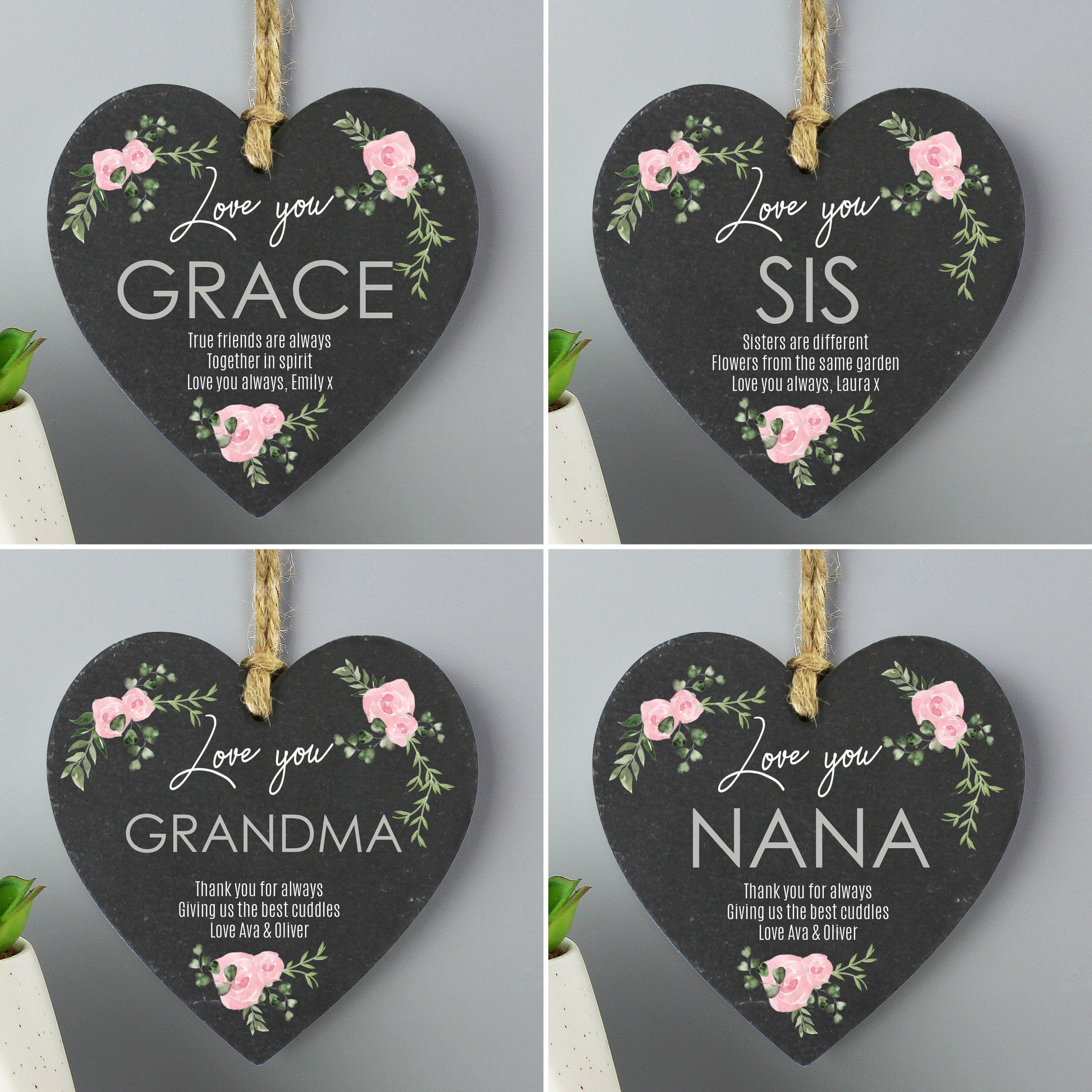 Details: This cute abstract rose slate heart is the perfect gift for any special lady in your life. The decoration can be personalised with a name or role up to 12 characters long and 3 message lines with 40 characters available per line. The Name / Role will appear in UPPERCASE. The message will appear as entered. 'Love You' is a fixed part of the design. PLEASE NOTE- Each slate piece will be unique as the item is cut by hand. Due to the nature of slate there will be some differences in the stone (such as texture, cut and smoothness). This may result in natural faults in the surface and edges of the product including flaking and uneven corners. Each item contains speckles of fools gold which makes a stunning feature and adds to the rustic feel however it may be at times within the area of your personalisation. Weight of product 0.135kg Weight of Product and outer packaging 0.255kg Perfect for: Mother's Day, Valentines Day, Birthdays