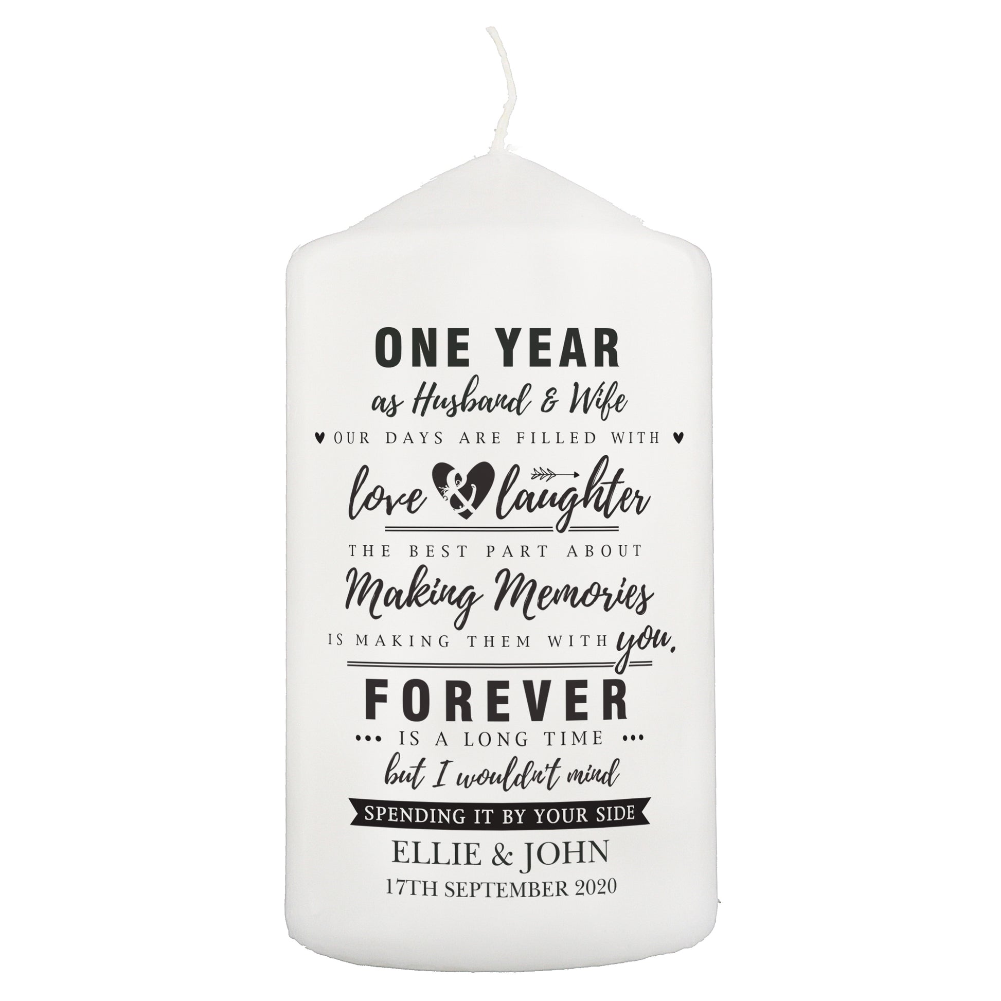 Details: This Personalised Candle makes the perfect Anniversary present. Personalise this Candle with up to 2 lines of 25 characters at the top, this is the first 2 lines. You can also personalise this Candle with up to 2 lines of 25 at the bottom, this is the last 2 lines. The fixed text reads; OUR DAYS ARE FILLED WITH love & laughter THE BEST PART ABOUT Making Memories IS MAKING THEM WITH you. FOREVER IS A LONG TIME but I wouldn't mind SPENDING IT BY YOUR SIDE What's more, this candle comes presented in an organza bag. Burn time approx. 58 Hours Ideal for, Anniversaries