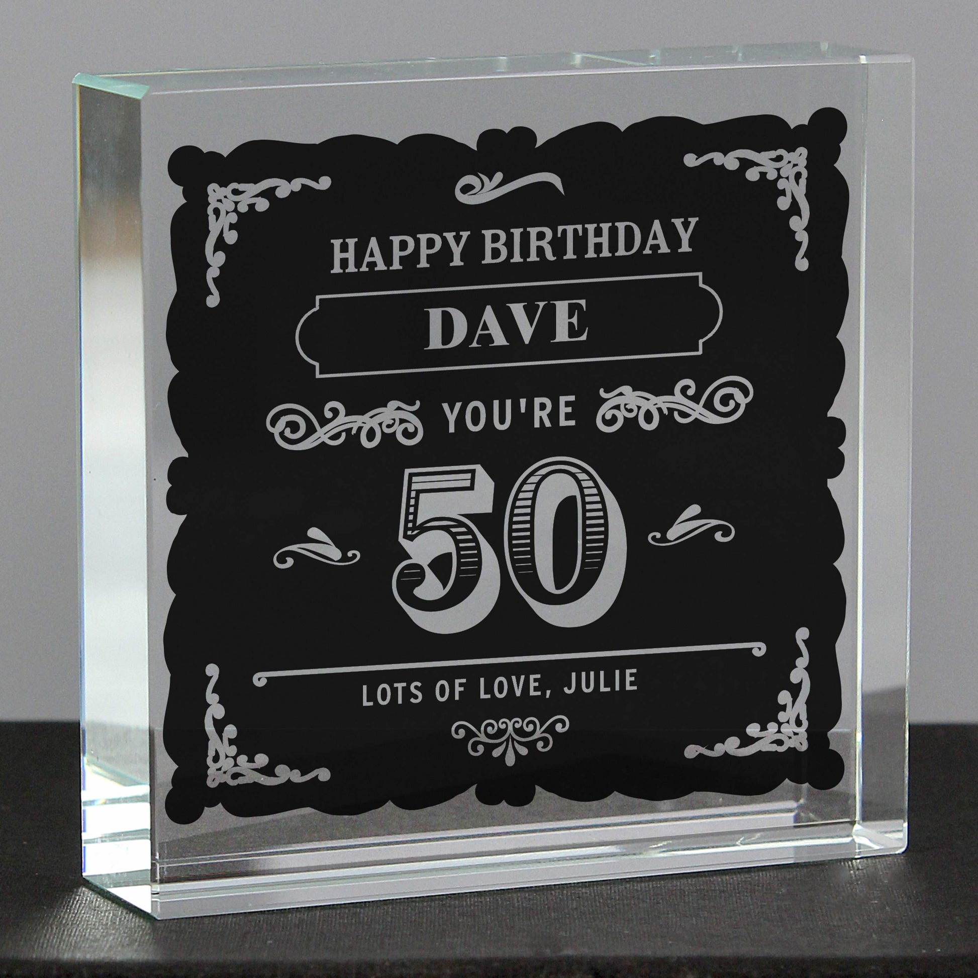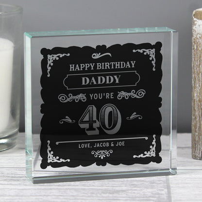 Details: A special crystal token with a unique vintage style typography design is a gift which is sure to be treasured! Personalise this token with: Line 1 - (Name) - up to 12 characters long - fixed upper case text. Line 2 (Age) - up to 2 characters long Line 3 - (Message) - up to 20 characters long - fixed upper case text. Please note "Happy Birthday" and "You're" is fixed text and cannot be changed. Comes presented in a black gift box. Ideal for Birthdays.