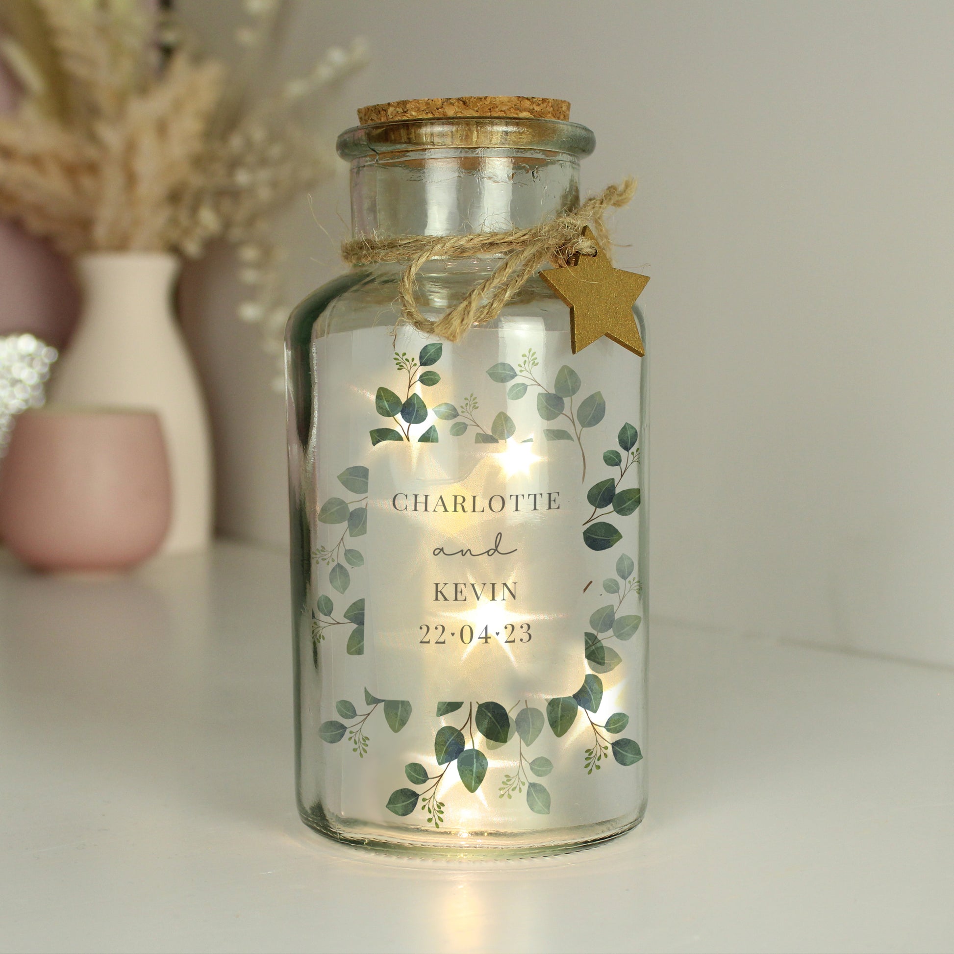 Details: This beautiful Personalised Botanical LED Glass Jar is a perfect gift for the newlyweds! Personalise this LED Glass Jar with up to 4 lines of text, each containing up to 15 characters, including spaces and punctuation. Please note, Line 2 is case sensitive and will appear as entered, please refrain from using fixed upper case as this could make the script font difficult to read. All other personalisation will appear in fixed upper case. All personalisation will appear as entered The jar is 16.5cm Tall and 8.5cm wide and comes with LED lights and LR44 battery included. The material of this jar is glass. Perfect for Weddings, Anniversaries
