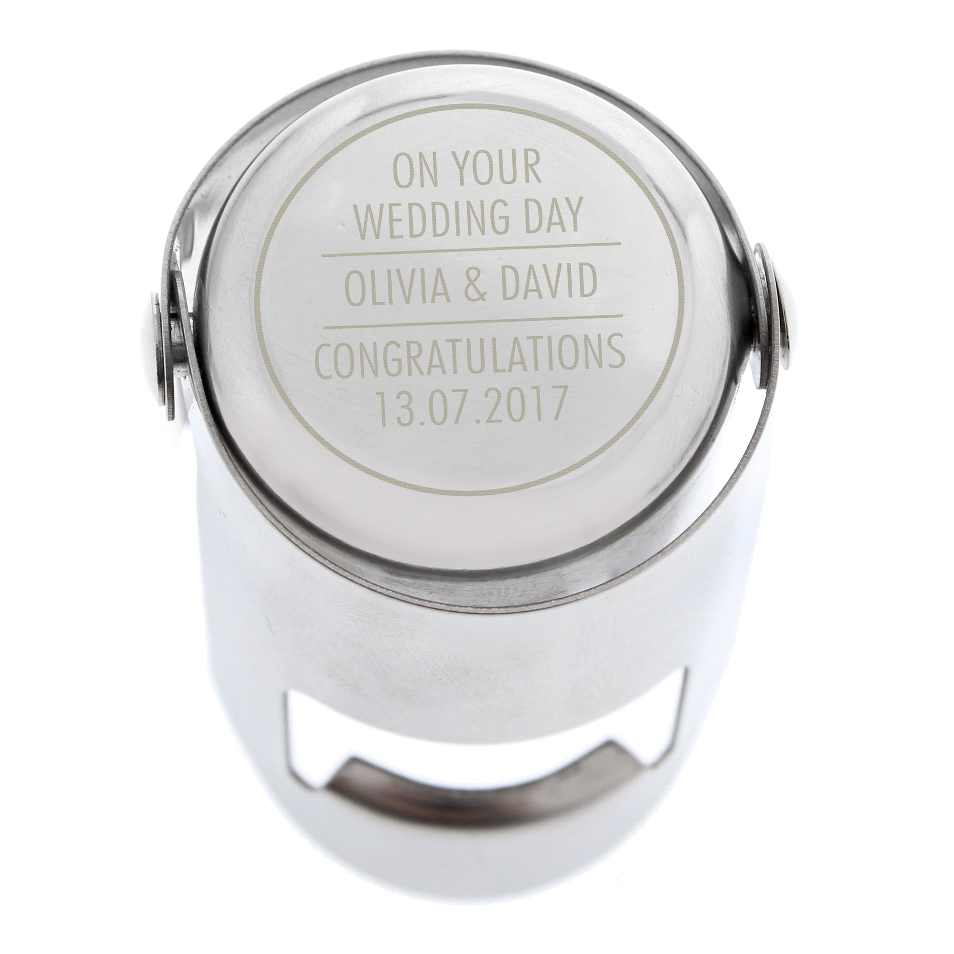 Details: Our personalised 'Any Message' Stainless Steel Bottle Stopper ensures the airtight closure of champagne bottles and wine bottles that use corks. Works equally well on Prosecco, Champagne and sparking wine. It's perfect as a unique and thoughtful gift for any celebration. The bottle stopper can be personalised with 5 lines of text. Lines 1 and 5 can hold 12 characters. Lines 2 and 4 can hold 15 characters. Line 3 can hold 20 characters. All text will appear in upper case. Ideal for weddings, anniversaries, engagements and Valentine's Day.