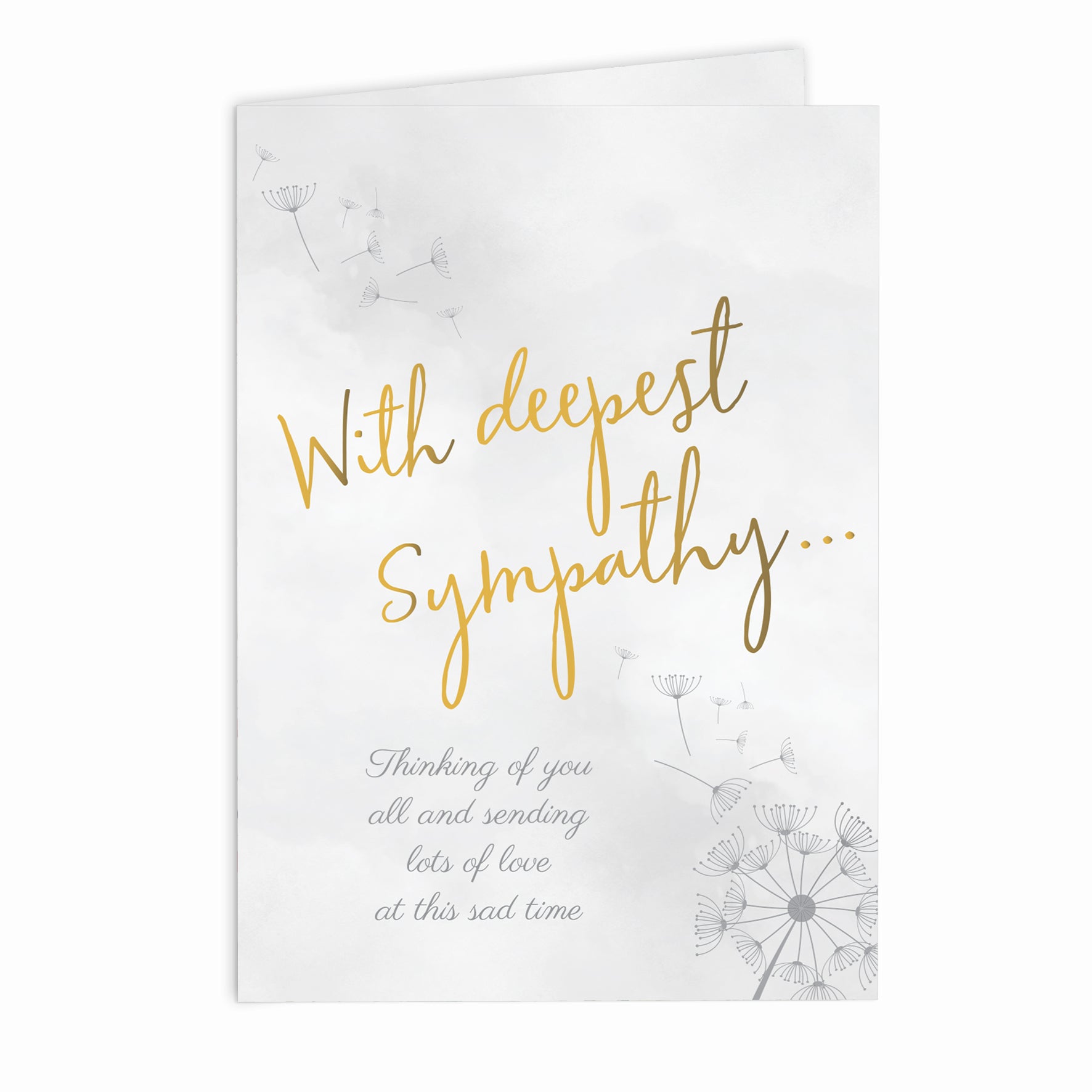 Details: This Personalised 'With Deepest Sympathy' card is both beautiful and elegant. The perfect way to send your condolences to a friend or loved one. Featuring delicate dandelion seeds and clocks, with gold foil effect writing. 'With Deepest Sympathy' is a fixed part of the design and cannot be amended. Personalise the front of this card with a message over 4 lines of up to 20 characters per line. Personalise the inside of this card with a message over 4 lines, with up to 25 characters per line. NOTE: Due to the font type used please refrain from using all capitals in your personalised message. If the message is all in capitals you will find the personalisation extremely difficult to understand and may even result in personalisation being missed off the product. Many thanks for your cooperation. Ideal for Remembrance, Condolences, Sympathies, Memorials.