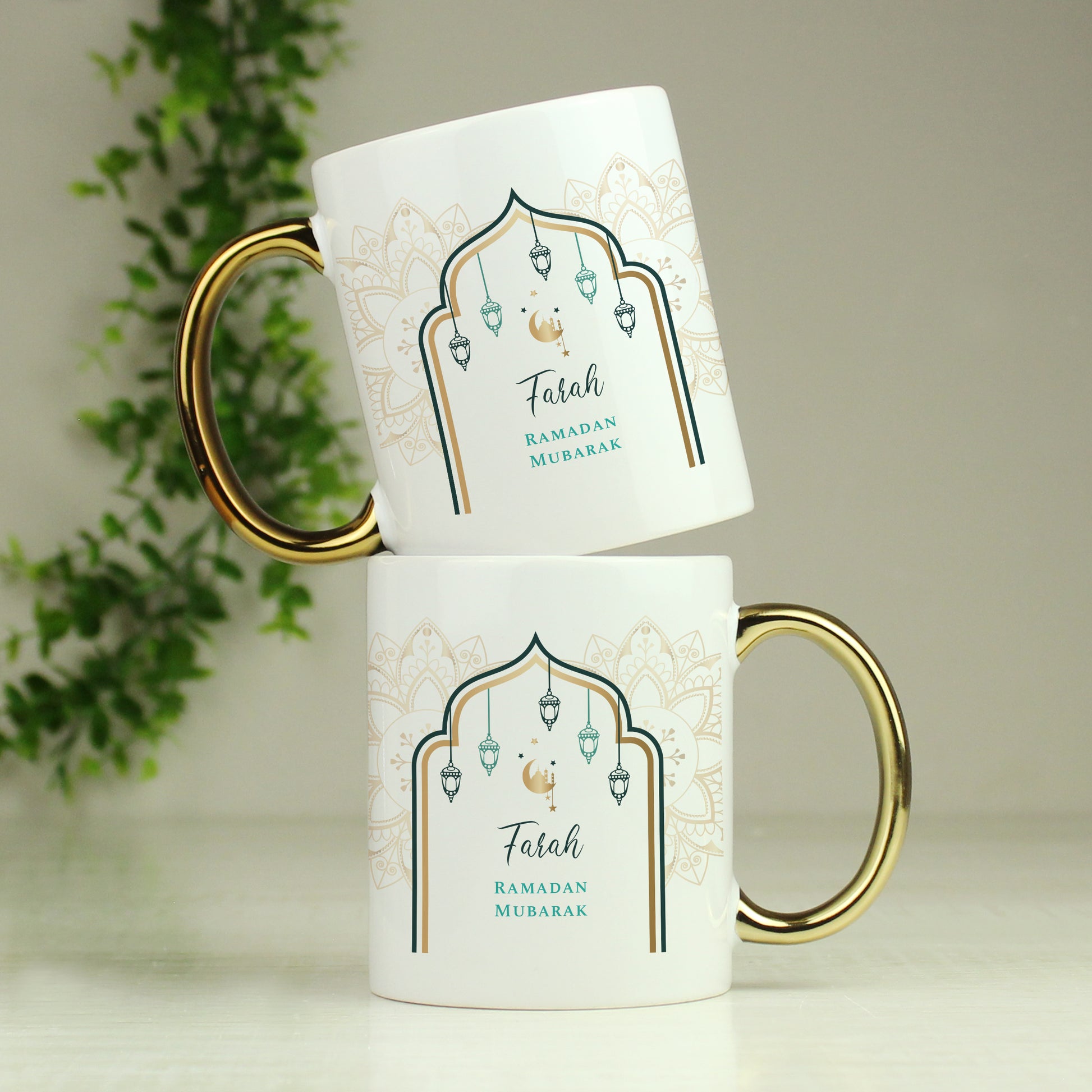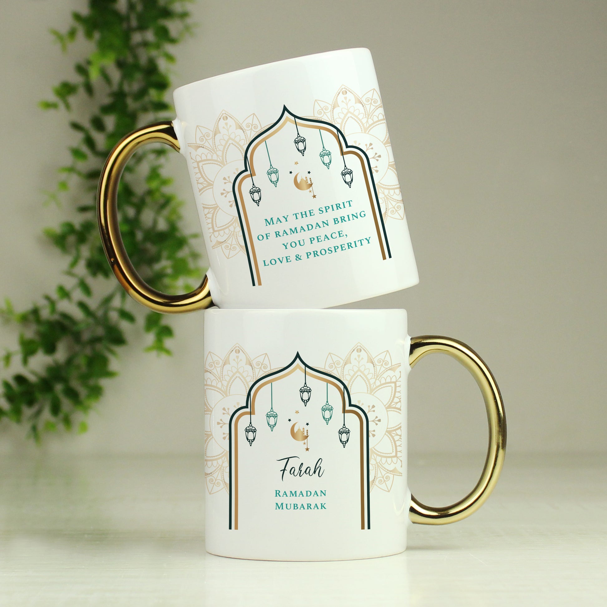 Details: This Personalised Eid & Ramadan Gold Handled Mug is a lovely, unique gift. Personalise this mug with a name up to 15 characters and two lines of 25 characters on the front. You can then add an additional 5 lines of 25 characters on the reverse to make this an extra special gift. Please note, the name is case sensitive and will appear as entered. Please refrain from using fixed uppercase as this may make the script font difficult to read. All other text will appear in fixed uppercase. Please do not include accents and special symbols as some of our processes will not allow this. Hand washing is recommended. Not Microwave safe. Material is ceramic. Ideal for Ramadan and Eid