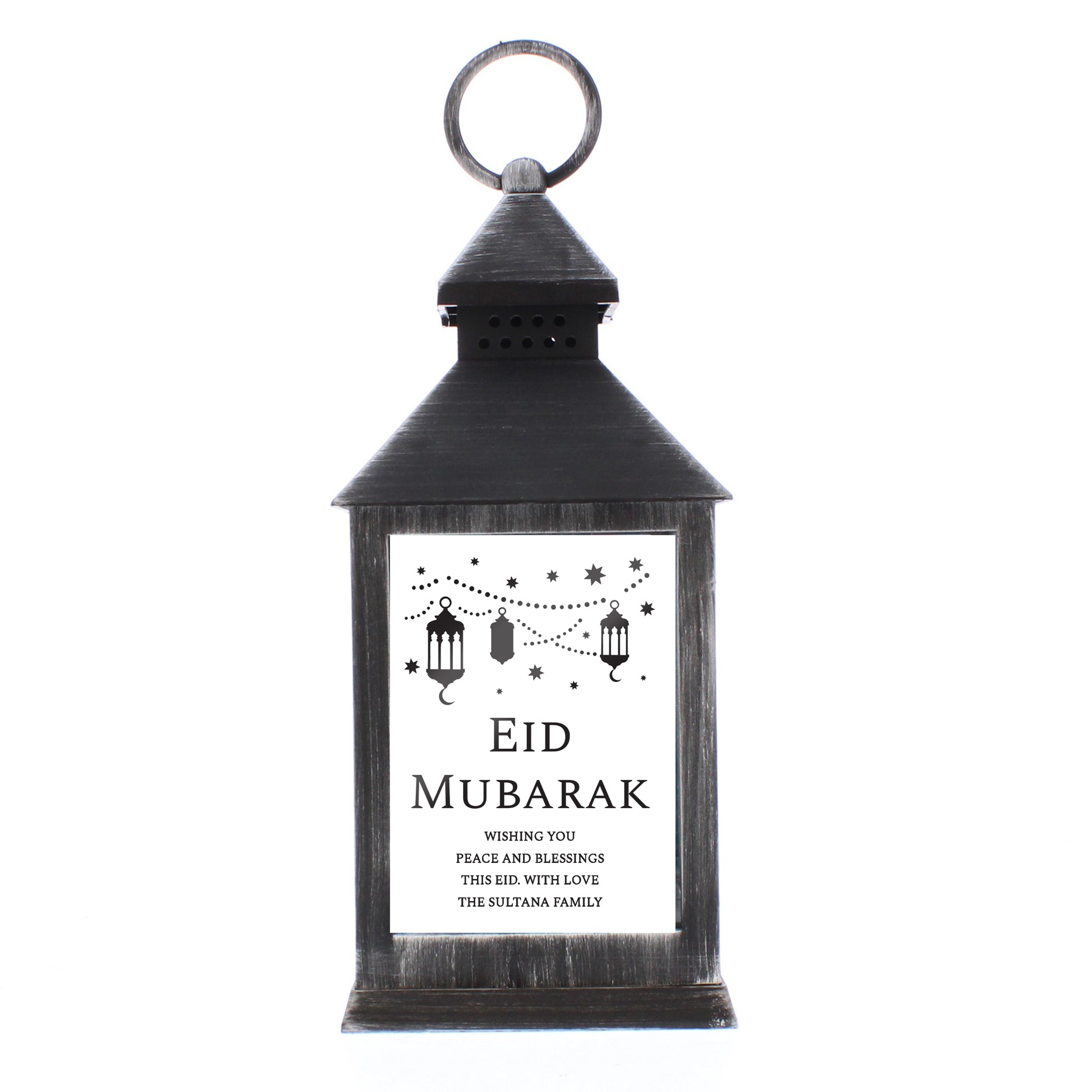 Details: This personalised black lantern is a lovely gift to celebrate the end of Ramadan. You can personalise this lantern with 6 lines of personalisation. Lines 1 & 2 have up to 12 characters available. Lines 3 to 6 have up to 25 characters available per line. The personalisation will appear in fixed uppercase. Please do not include accents and special symbols as some of our processes will not allow this. The battery-powered lantern has a realistic flickering warm orange flame effect, adding an ambient touch to any room. The lantern is easy to hang around the home with the hoop attached. The lantern can be switched on/off from a switch on the base. Please note that the lantern is supplied without batteries. The lantern requires x3 AAA batteries. This product has a matt plastic finish. Suitable for indoor use only. Perfect for Eid