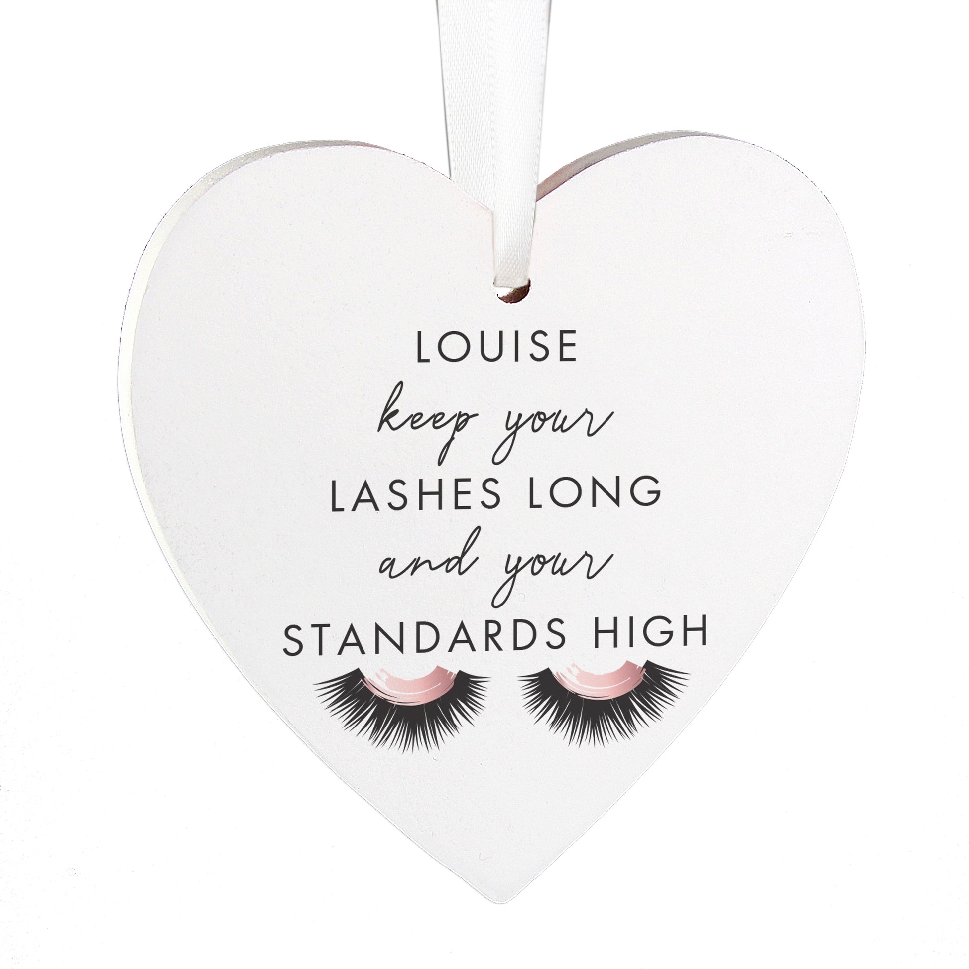 Details: This Personalised Eyelashes Wooden Heart is the perfect gift for any make up fan. Personalise this heart with a name using up to 12 characters Text entered will appear in Uppercase. The following text is a fixed part of the design: Keep your Lashes long And your Standards high Please note that these items are made from solid wood and therefore may contain some imperfections due to their natural material. Decorations are supplied ready to hang straight on to a gift, or around the home. This item is not available for next day delivery. Perfect for Valentines, Wedding and Anniversary