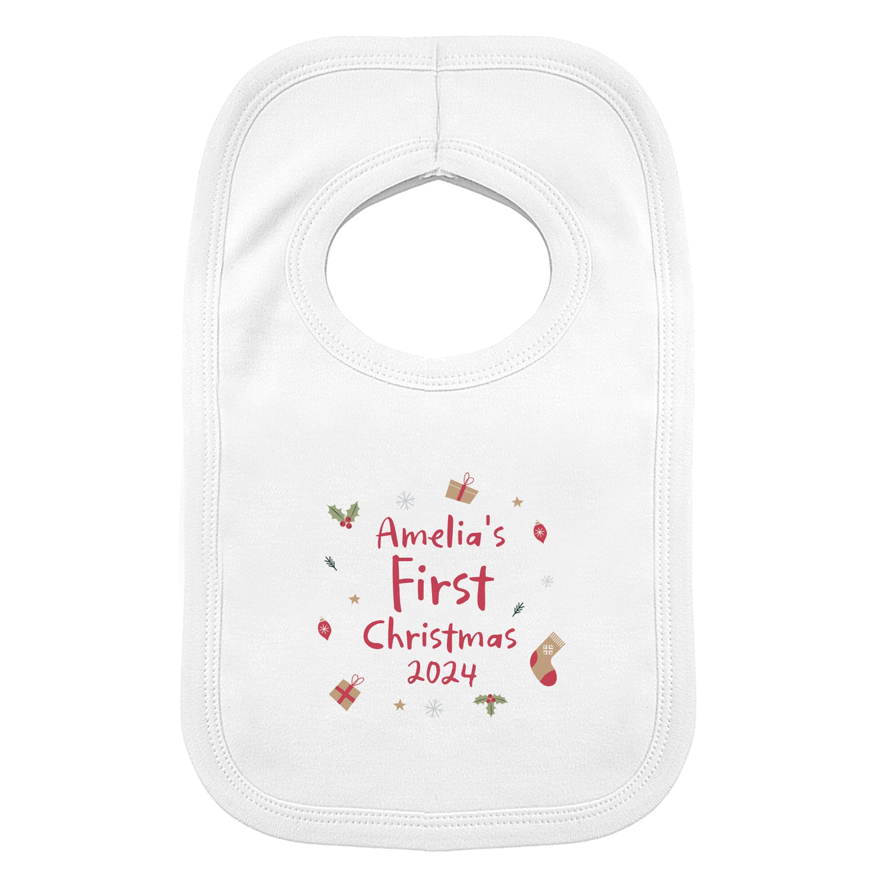 Details: This adorable Personalised First Christmas Bib is perfect for celebrating baby's magical first Christmas. The bib can be personalised with a name up to 12 characters and a year of upto 4 characters long. Personalisation will appear as entered. 'First Christmas' is fixed text and cannot be changed This 100% cotton baby bib is sized 0-3 months. Cool wash only. Iron on reverse only. Ideal for Christmas. Baby's First Christmas