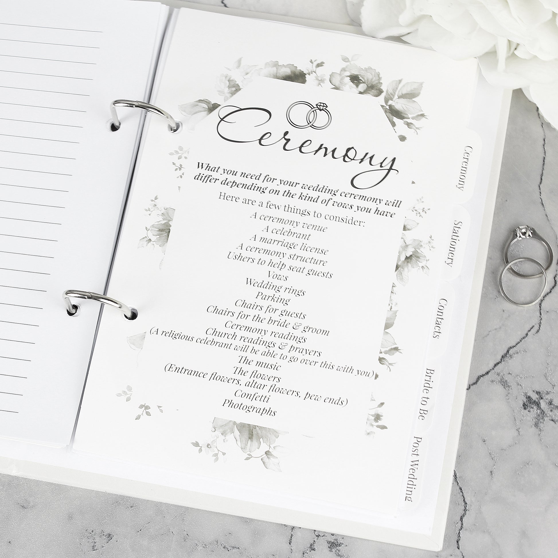Details: Ensure your wedding is planned to perfection with this Personalised Floral Watercolour Wedding Planner! This wedding planner can be personalised with 2 names of up to 12 characters each. The & symbol and the words 'wedding planner' are fixed. Please avoid entering the names in block capitals, as this may make them difficult to read. This ring-bound wedding planner includes sections for the ceremony, stationery, contacts, Bride to be and post wedding. Each section begins with a checklist of key milestones to tick off for your wedding. The planner also contains approximately 60 pages of lined paper. Ideal for weddings.