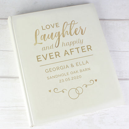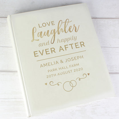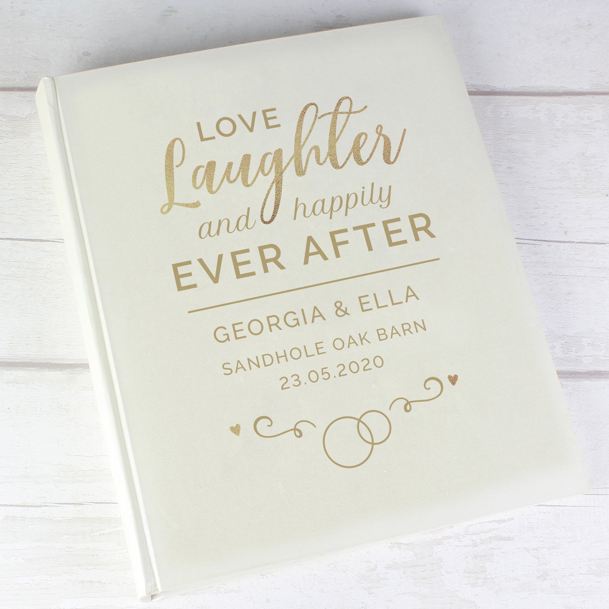 Details: This elegant Personalised Wedding Traditional Album is an ideal way to present treasured memories. This guest book can be personalised with up to 3 lines of text, with a maximum of 20 characters per line. The personalisation is in fixed UPPERCASE . Please note 'Love, Laughter and Happily Ever After' and 'Guest Book' is fixed text and cannot be changed. The album has approximately 30 tissue interleaf pages and a satin finish. Ideal for weddings.