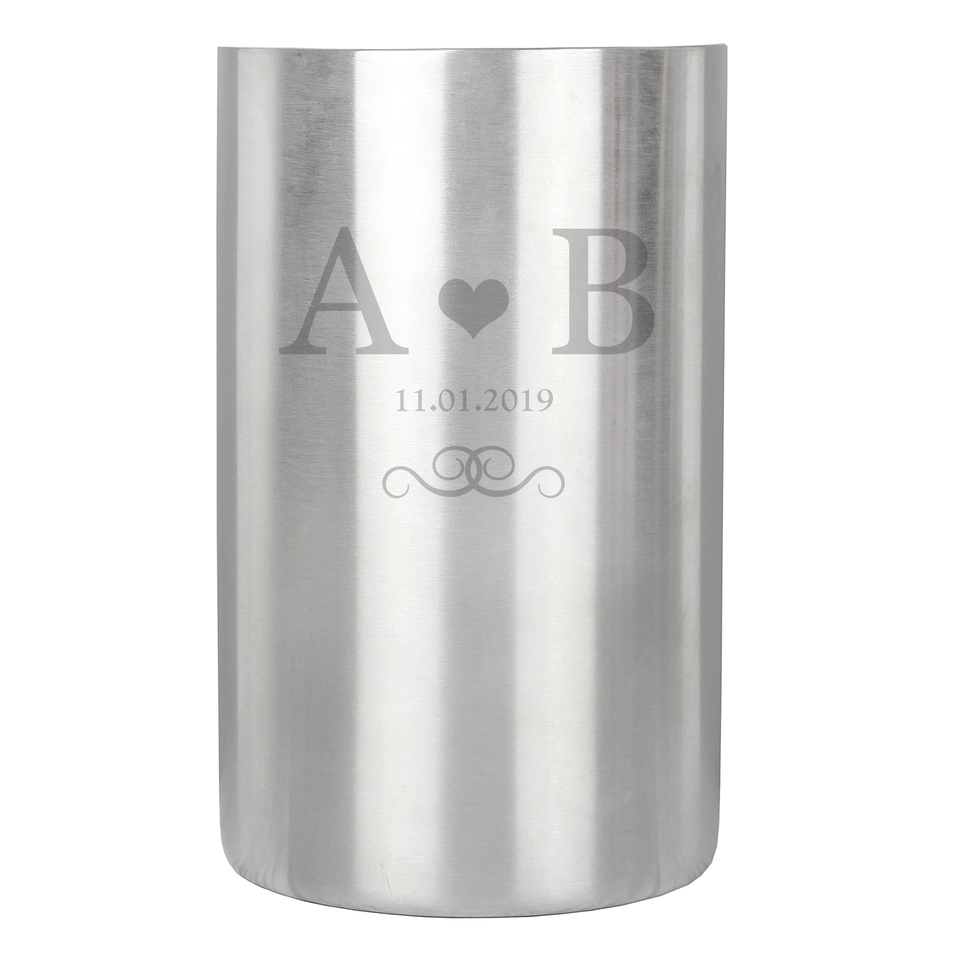 Details: This stylish and contemporary, brushed, stainless steel wine cooler will grace any table. It has double walled insulation for effective cooling and can hold most standard wine and champagne bottles. Steel is the material for an 11th Wedding Anniversary and this Wine Cooler would make the perfect gift! Personalise this Monogram Stainless Steel Wine Cooler with 2 initials and date up to 20 characters. Suitable for our 70cl wine and has a 10cm diameter. Hand Wash Only. All personalisation will be automatically capitalised. Ideal for Weddings, Anniversary & Engagements.