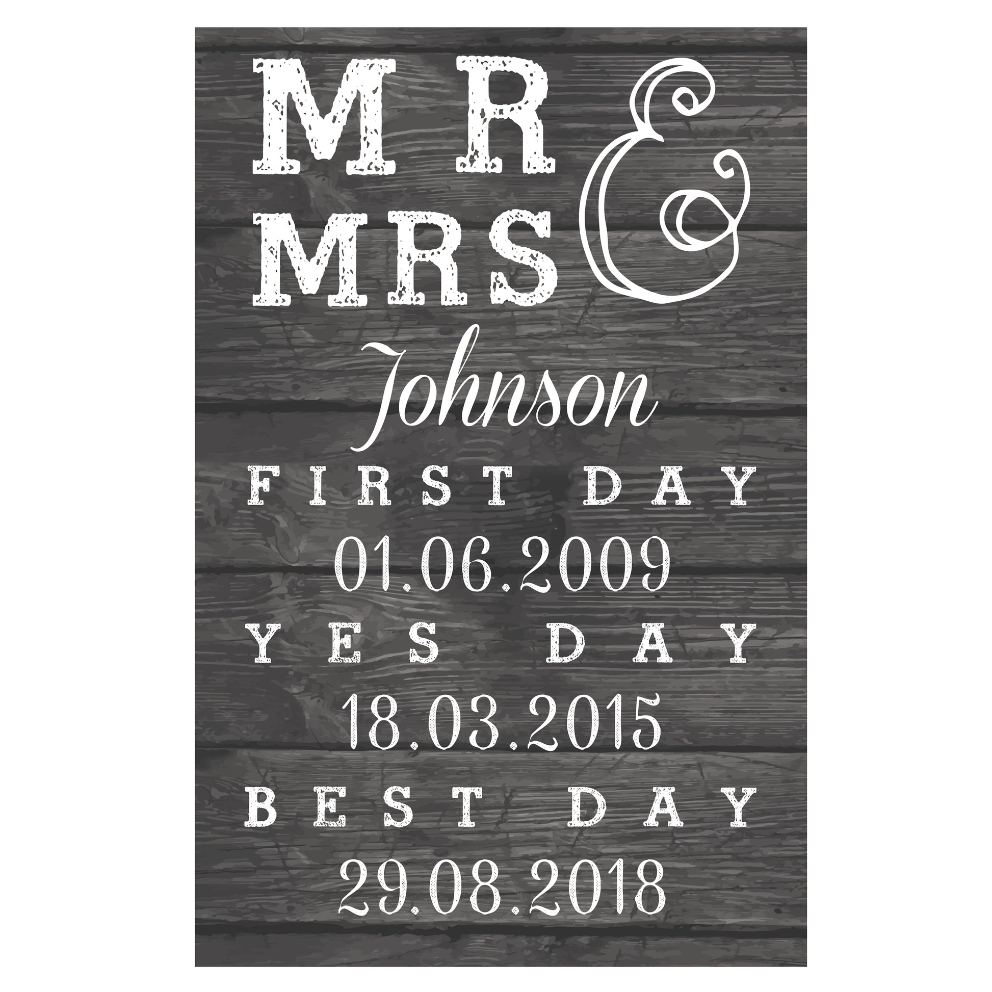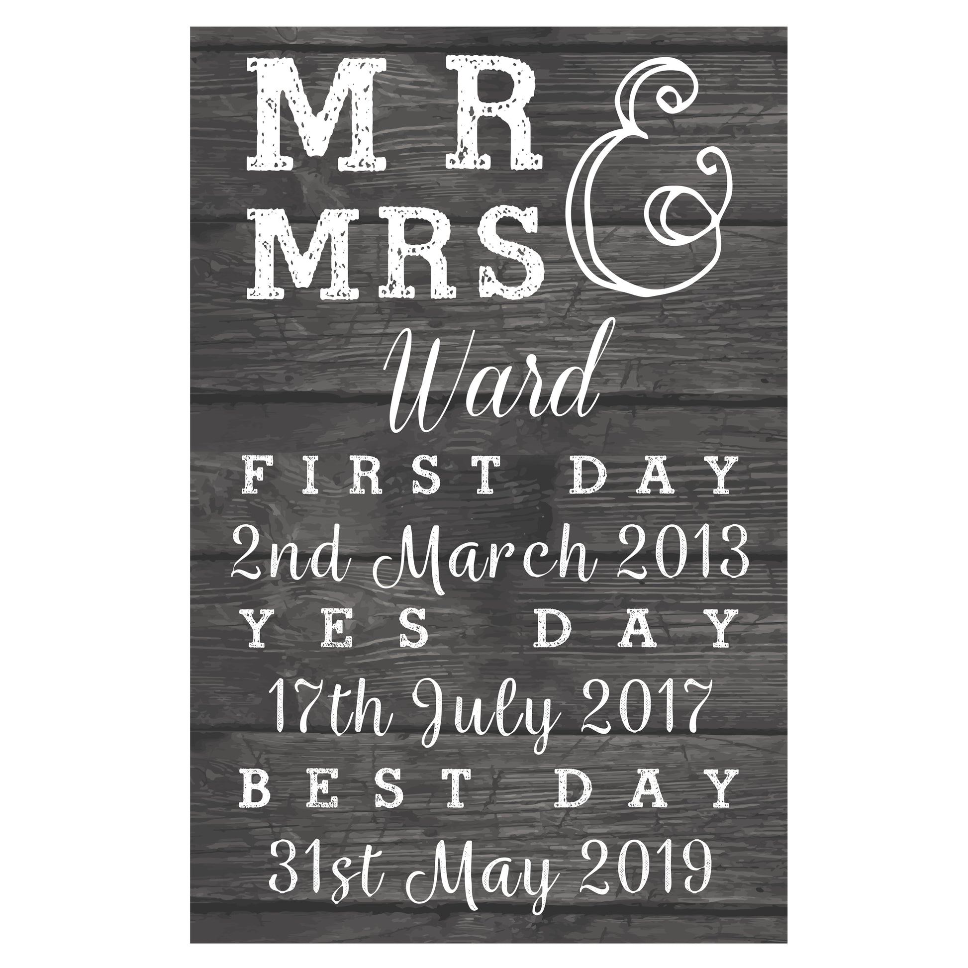 Details: Our Personalised Mr & Mrs, First Day. Yes Day, Best Day Metal Sign is an ideal way to celebrate the happy couple's special day. The sign can be personalised with up to 4 lines of text, with a maximum of 15 characters per line. The first line will be the surname of the couple. The second line will be the first date. The third line will be the engagement date with the fourth line being the wedding date. All personalisation will appear as requested. Please refrain from using block capitals as this can make the personalisation hard to read. Please note the words 'Mr & Mrs', ' First Day' 'Yes Day' and 'Best Day' are fixed text. This sign is made from aluminium. Ideal for Valentines, Anniversaries, Weddings
