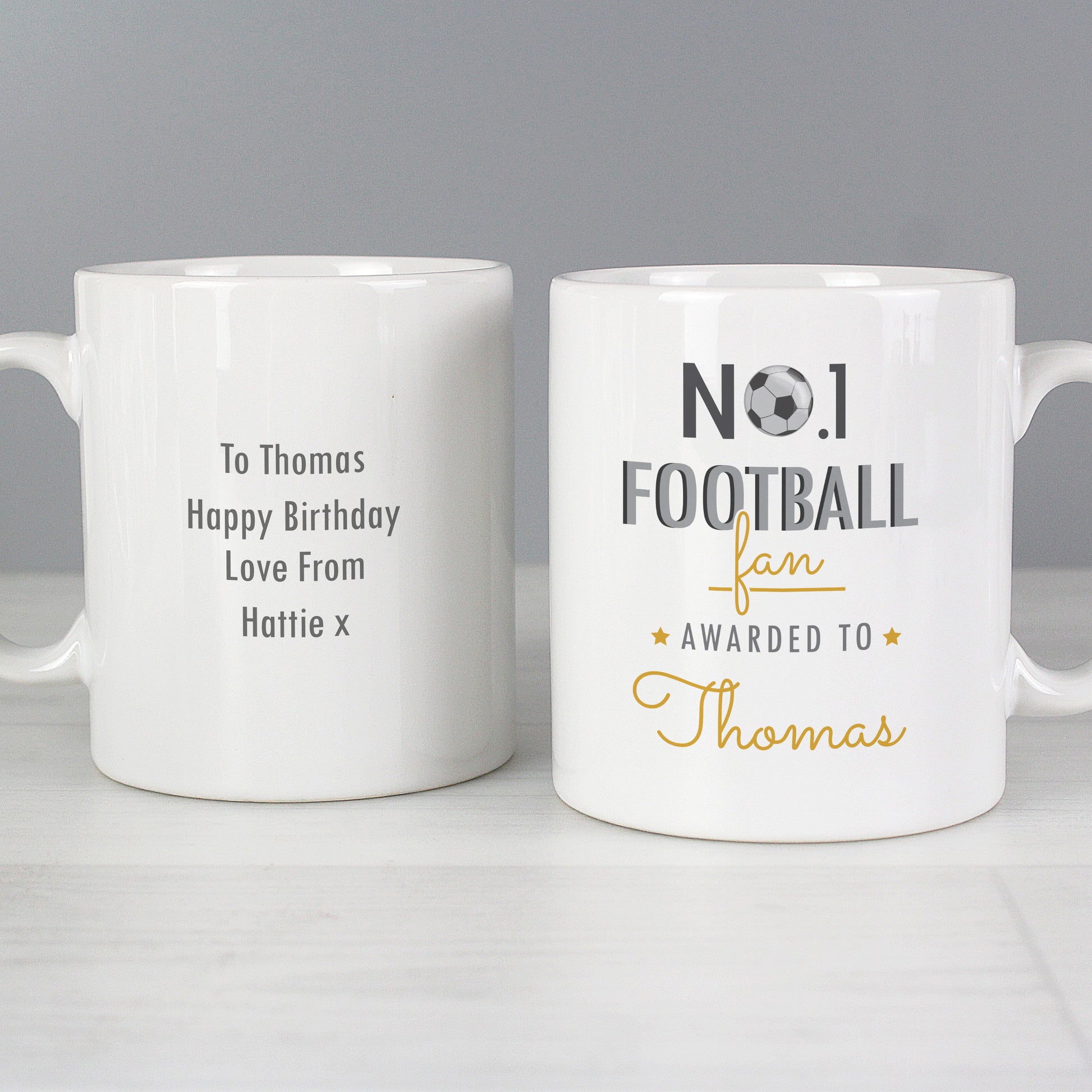 Details: This Personalised No.1 Football Fan Mug is a must-have for any fan of the beautiful game! The front of the mug can be personalised with a name up to 12 characters. The reverse of the mug can be personalised with 4 lines of text, with up to 20 characters per line. All text is case sensitive and will appear as entered. Please avoid entering your text in block capitals, as this may make the personalisation difficult to read. The text 'No.1 Football Fan' and 'Awarded to' is fixed and cannot be amended. What's more, this fantastic gift can also be made and despatched in 48 hours. Ideal as a stocking filler or a Secret Santa gift Hand washing is recommended. Material is ceramic. Ideal for Father's Day and Birthdays.