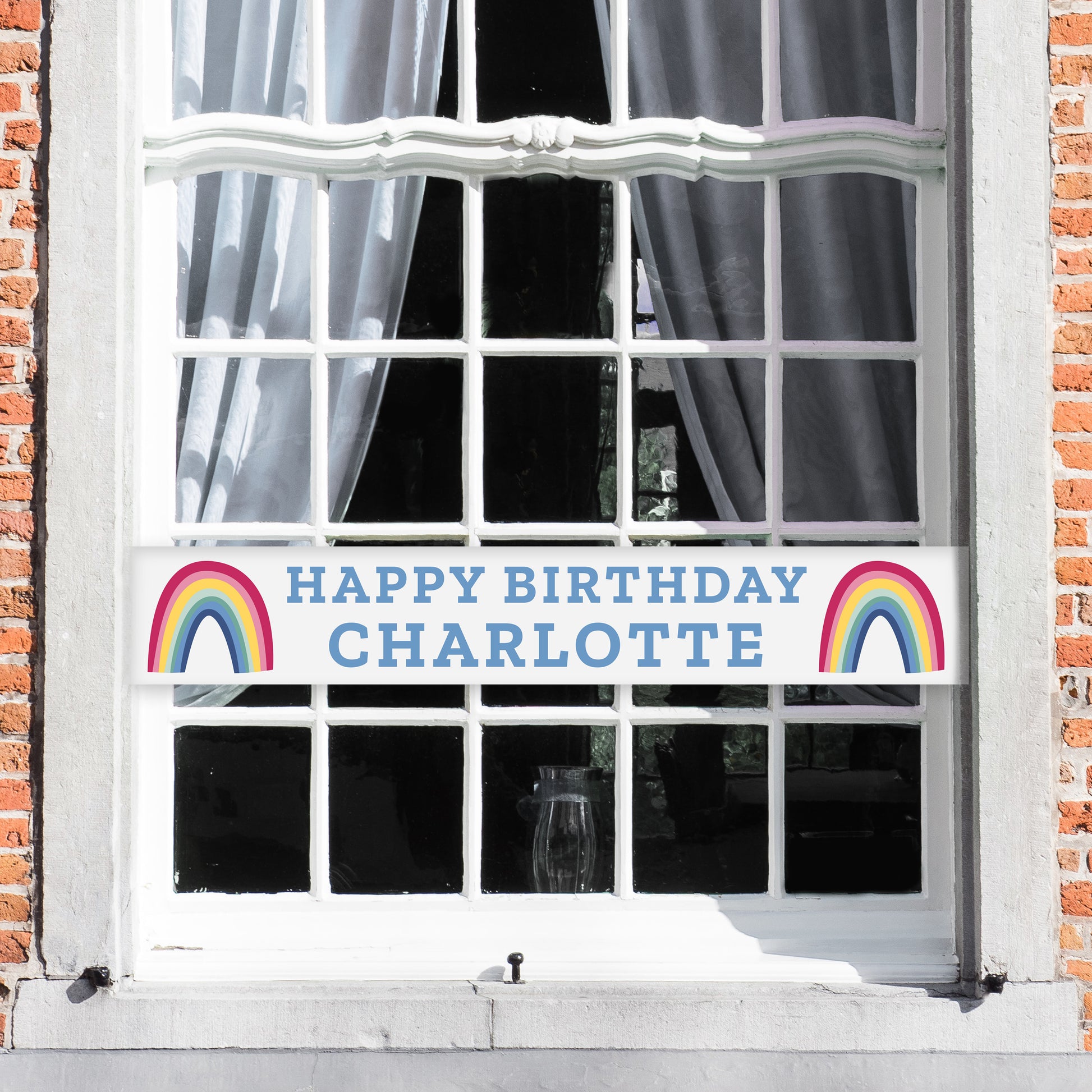 Details: Personalise this cute Personalised Rainbow Banner with a message spread over two lines, using up to 20 characters per line. The banner is made of vinyl material. Measures up to 110cm. Ideal for Birthdays!