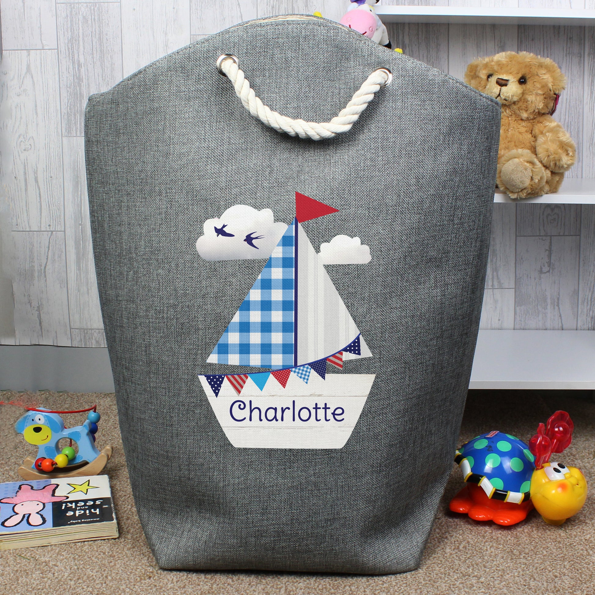 Details: Our Personalised Sailboat Storage Bag is perfect for keeping a bedroom or bathroom tidy. It's ideal for storing toys or even for use as a laundry bag. This storage bag can be personalised with a line of text of up to 15 characters. Please note that all personalisation is case sensitive and will appear as entered. Please avoid entering your text in block capitals as this may result in the personalisation being difficult to read. This stylish storage bag features practical and stylish rope carry handles. The bag is made from sturdy polyester and also features a sturdy base, allowing it to maintain its shape whether empty or full. Wipe clean with a damp cloth. Not suitable for children under 36 months. This item is not a toy. Ideal for Children, Birthdays, New Home. Please note we cannot ship this item internationally