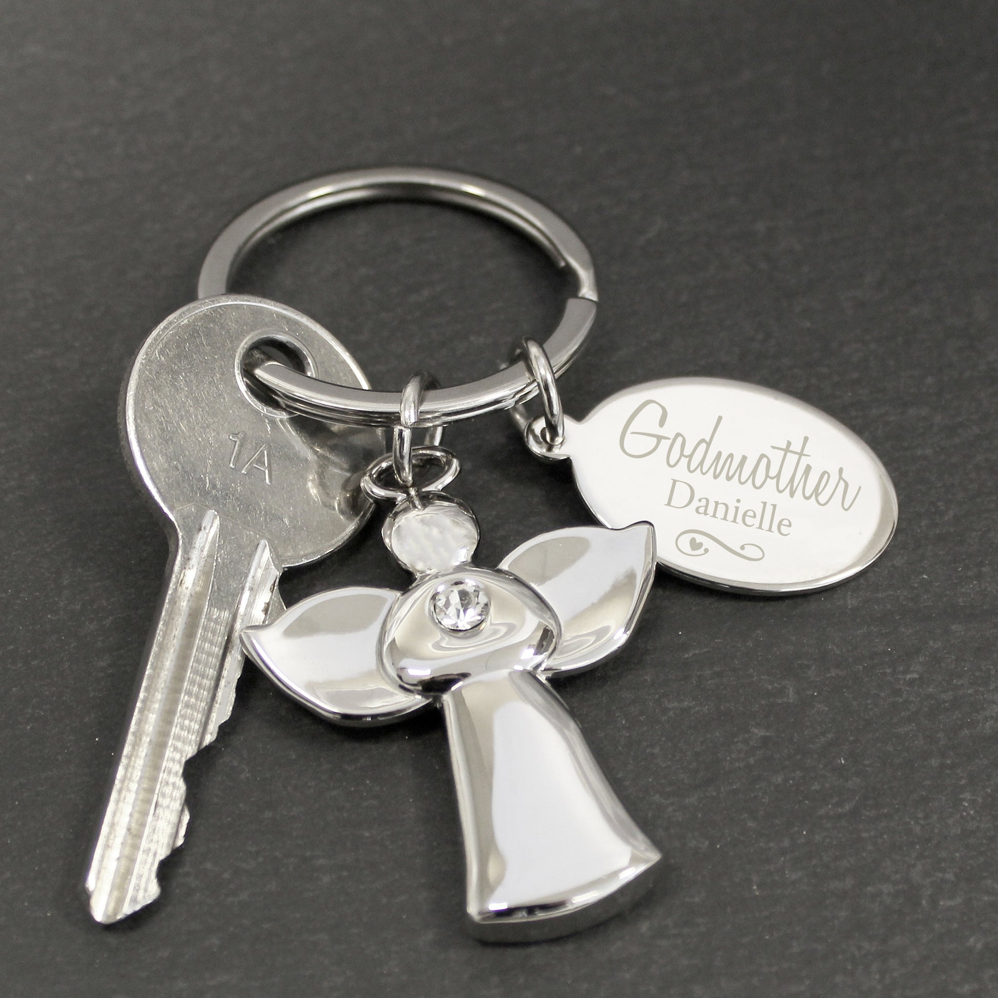 You are viewing: A Personalised Silver Plated Swirls & Hearts Godmother Angel Keyring