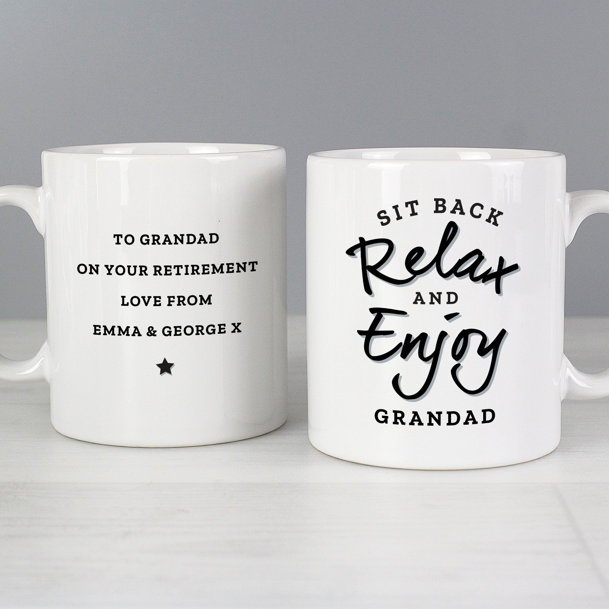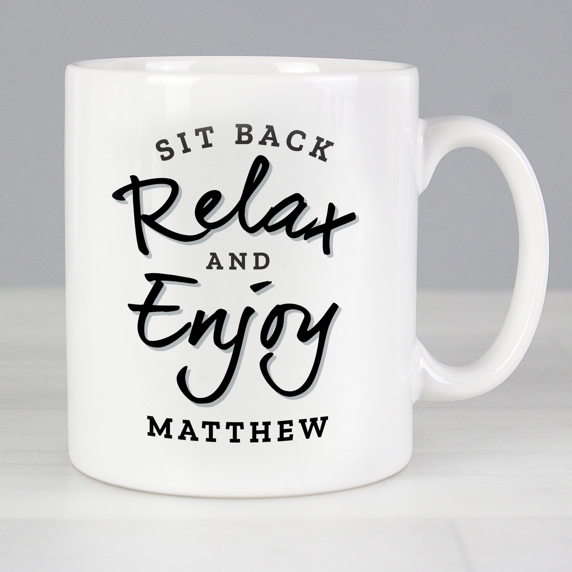 Details: This personalised mug is perfect for someone that deserves to sit back relax and enjoy a hot drink. This mug can be personalised with the following: On front (Name/role) - up to 12 characters long Up to 4 lines with 25 characters available per line. Sit Back Relax and Enjoy is fixed test and cannot be changed. All personalisation will appear in fixed uppercase. What's more, this fantastic gift can also be made and despatched in 48 hours. Hand washing is recommended. Material is ceramic. Ideal for Birthdays, Father's Day, Mother's Day