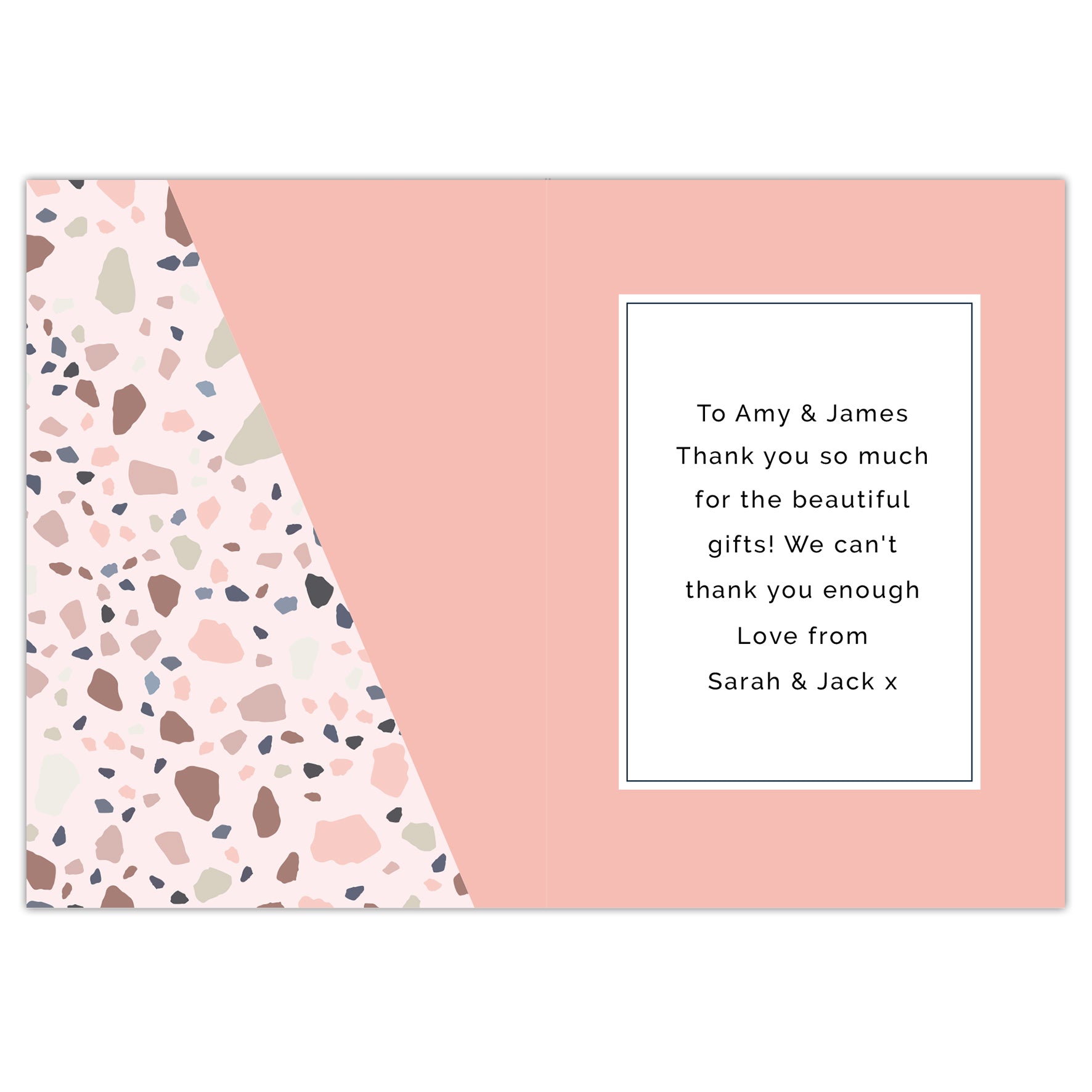 Details: This Personalised 'thank you' card is a great way show your appreciation to a friend or loved one. This modern terrazzo design has the following fixed wording 'THANK YOU' Personalise this card with Front: UPPER CASE Line 1 - up to 20 Characters Inside: Line 1 - up to 25 Characters Line 2 - up to 25 Characters Line 3 - up to 25 Characters Line 4 - up to 25 Characters Line 5 - up to 25 Characters Line 6 - up to 25 Characters Line 7 - up to 25 Characters This personalisation entered inside the card is case sensitive and will appear as entered. Ideal for Thank you, Teacher