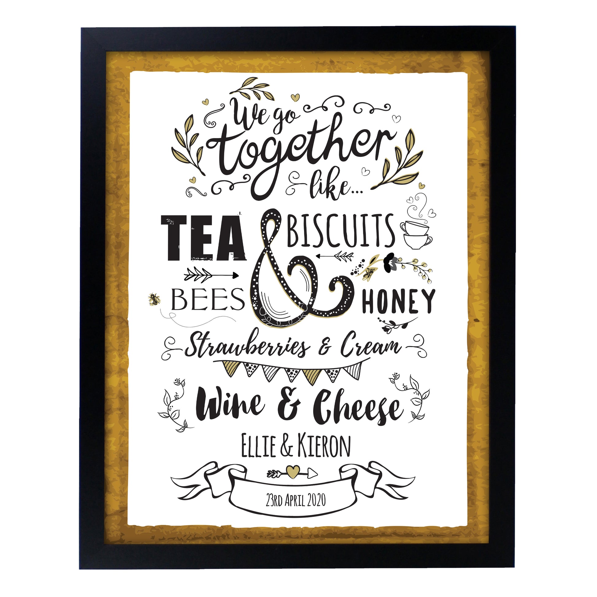 Details: A perfect gift for the special couple or to present to your loved one on Valentine's day! Personalise this Couples Black framed print with two names that will fit up to 20 characters and a message up to 20 characters in length (which will appear inside the banner at the bottom). The words 'We go together like...Tea & Biscuits, Bees & Honey, Strawberries & Cream, Wine & Cheese' are fixed. To finish this stylish piece of art each piece is mounted and framed in a large black frame. All personalisation appears in capital letters and the text design is fixed. Please include the & in between the names i.e. Sally & Mark Ideal for Valentines day, Anniversary, Weddings, Engagement.