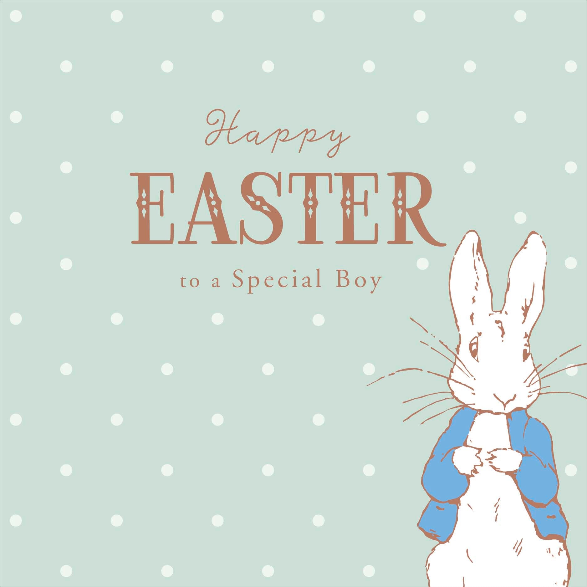 Details: A gorgeous foil finished Beatrix Potter Peter Rabbit Easter card for a baby boy