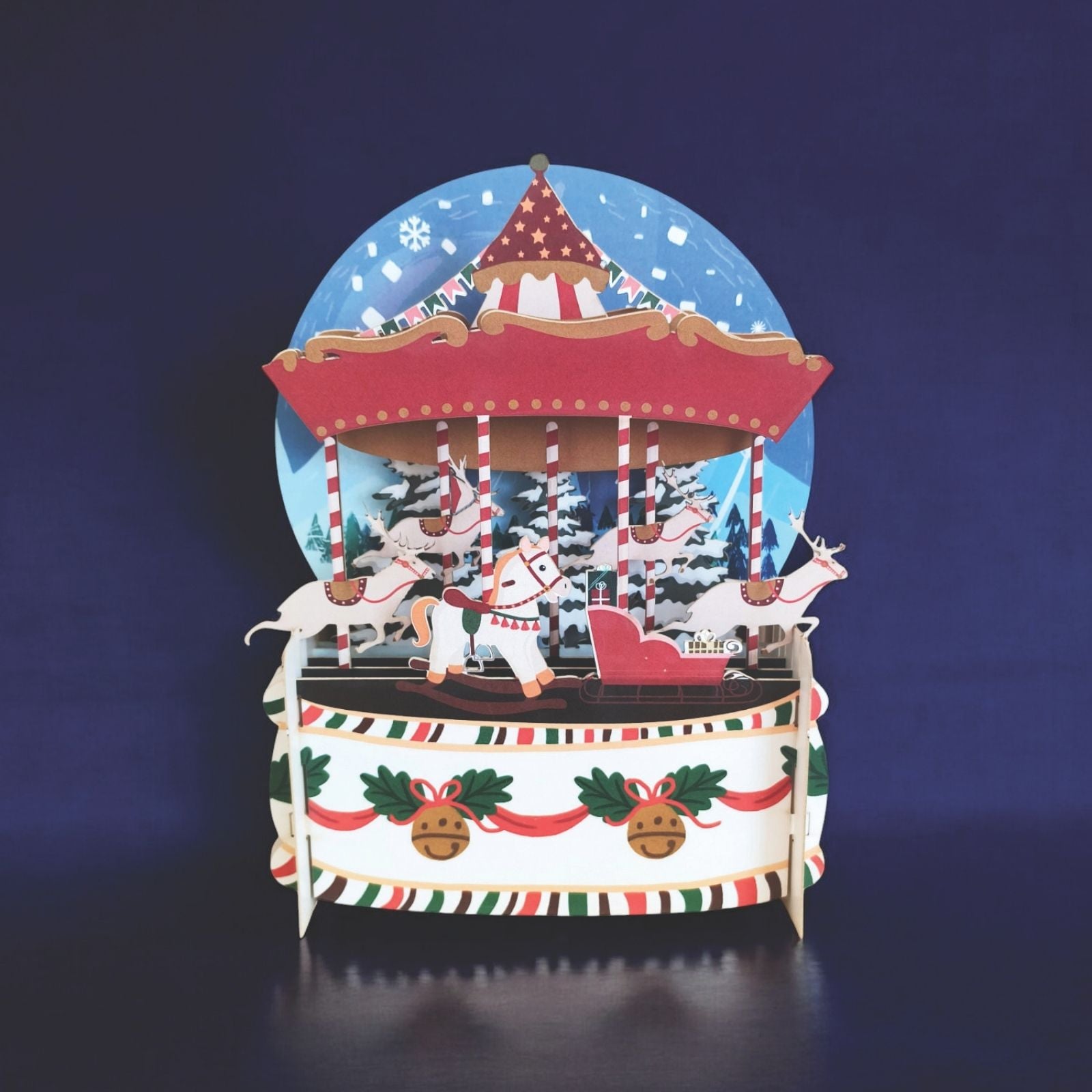 Looking for Christmas greeting card ideas for someone special? This enchanting pop-up card captures the magic of the season, featuring a delightful carousel amidst a snowy scene. Its intricate design and 3D effect create a heartwarming surprise, making it a perfect way to share joy and warmth with a loved one during the festive season.