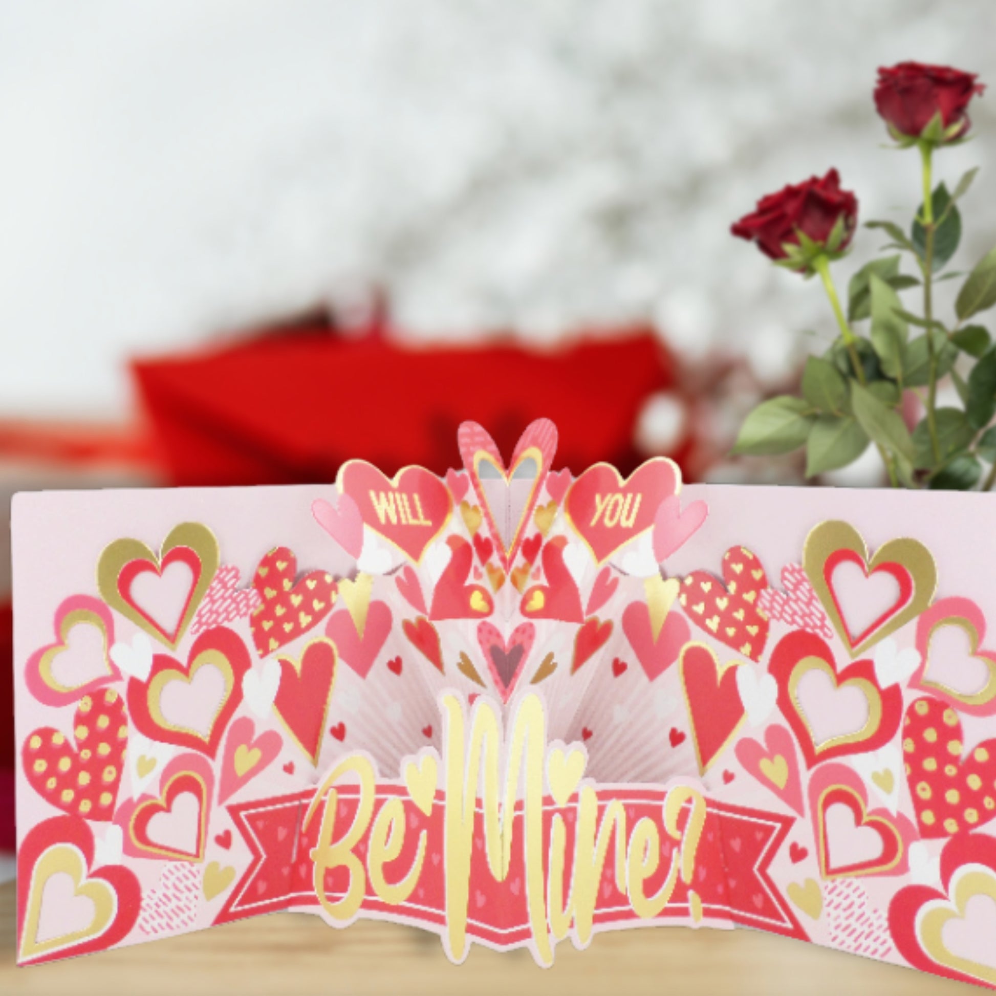 Looking for a special Valentine's card for them? This magical pop-up greeting card features a charming "Will You Be Mine" and love hearts design, along with a hidden tray of wrapped chocolates. It's the perfect way to capture your hopes and show your special someone just how much they mean to you this Valentine's Day!