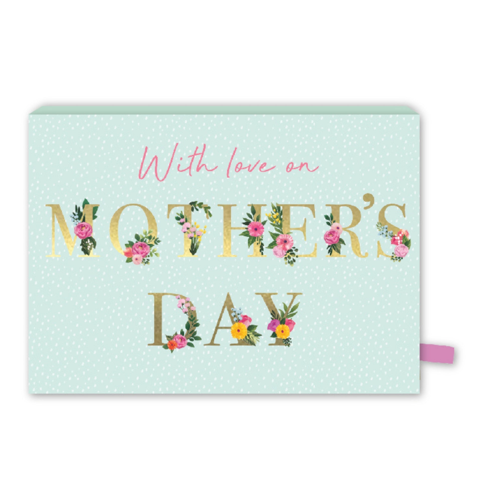 Details: This beautifully designed card from Second Nature features a surprise pop-out floral bouquet and a tray of wrapped chocolates. The caption on the front of the card "With love on Mother's Day" is decorated with gold foil.
