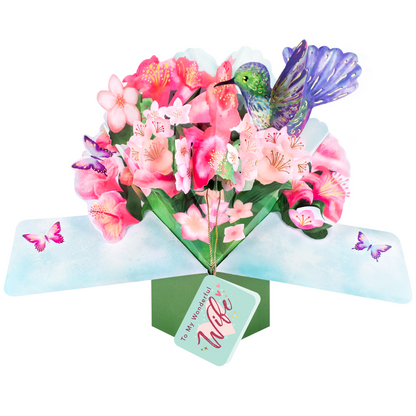 Why they'll love it: Send a card to a Wife that pops up to display a pretty pink arrangement of flowers and a gorgeous hummingbird and butterflies, sure to delight them on their special day.