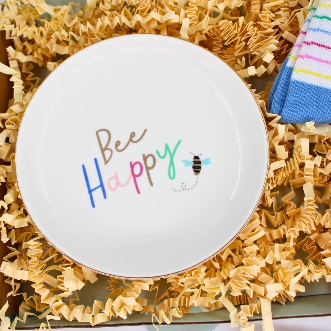 Details: This delightful letterbox gift features cheerful bee-themed socks, a charming ceramic trinket tray, and a bracelet adorned with a silver heart charm. Beautifully packaged with high-quality tissue and zigzag paper, it embodies positivity with the message, "Bee Happy - Just Bee You!" A perfect surprise to brighten her day.